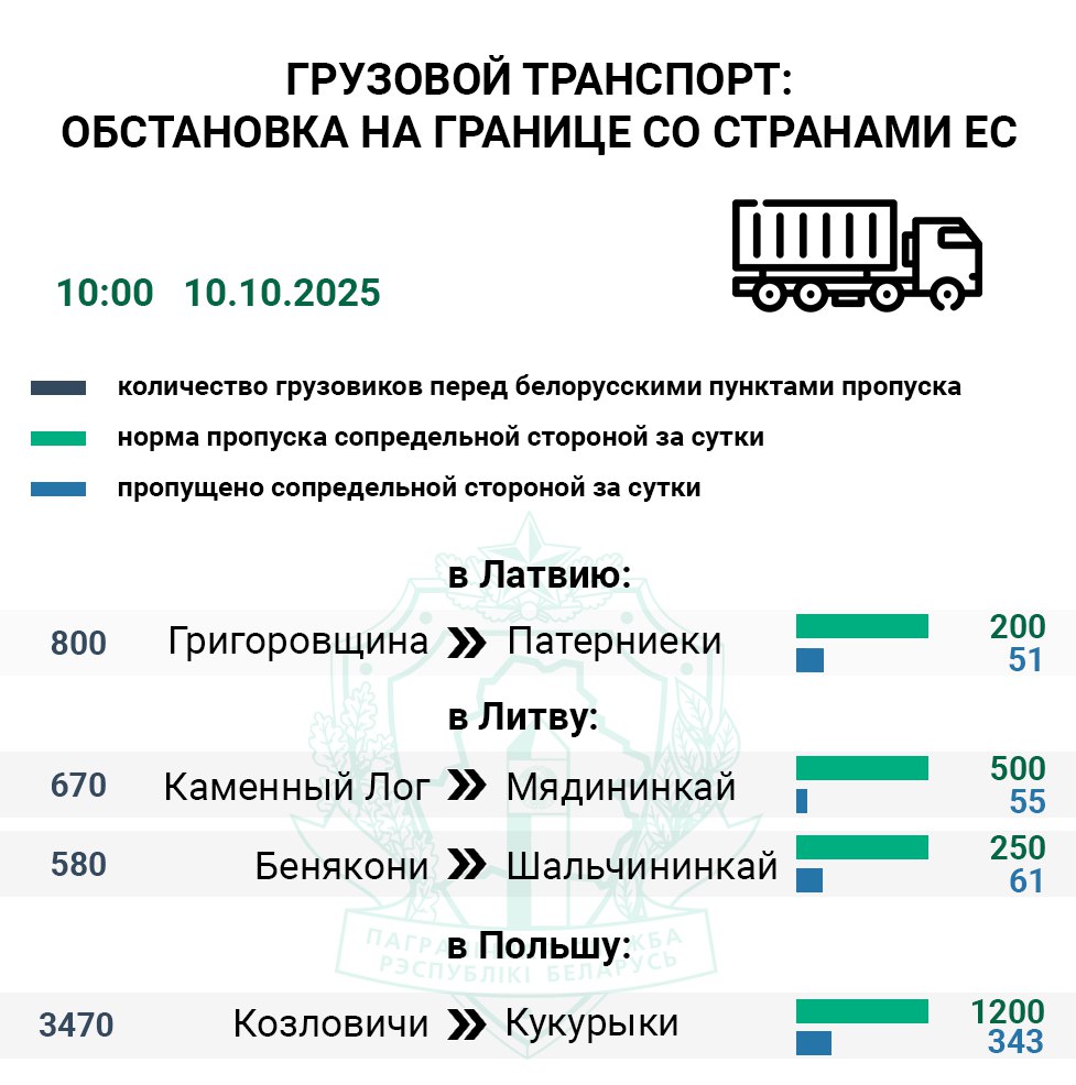 По состоянию на 10:00 въезда в Литву ожидают 1 250 фур. Меньше всего грузовиков с понедельника приняли в Мядининкае (Каменный Лог) — 9% транспорта от нормы. Через пункт пропуска Шальчининкай (Бенякони) на сопредельную территорию проследовало 27% большегрузов.