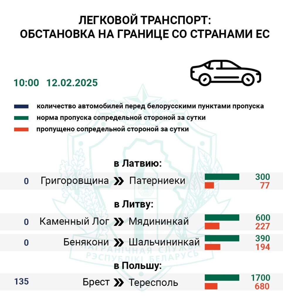 Очередь легкового транспорта фиксируется только перед польским погранпереходом Тересполь (Брест). Въезда на сопредельную территорию ожидают 135 легковушек. Польша приняла на свою территорию 40% транспорта от нормы.