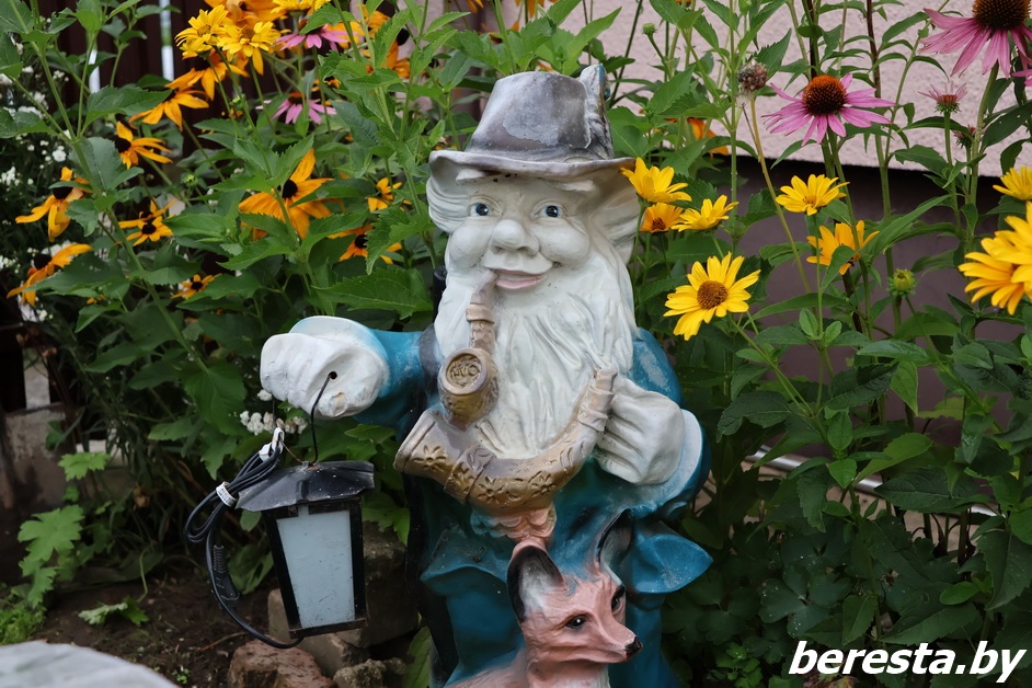 Особое предпочтение Янина Белевич отдает розам. Они у нее повсюду. Цветочные ансамбли дополняют декоративные кустарники. Удачно вписываются в ландшафтные решения и фигурки сказочных героев. Глядя на всю эту красоту, невольно задаешься мыслью − это сколько же необходимо труда и заботы: и полить, и прополоть, и подвязать, а еще следить за тем, чтобы внешний вид был красивым, радовал не только хозяйку, но и окружающих!