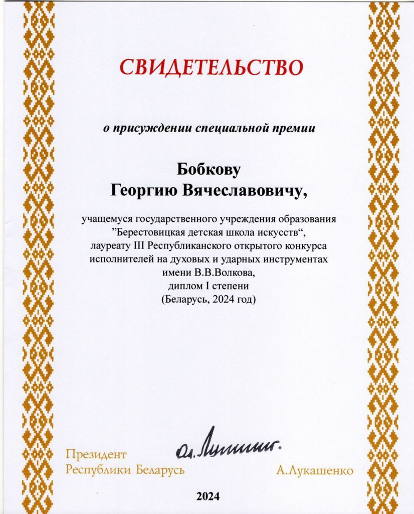Напомним, Георгий Бобков награжден специальной премией специального фонда Президента Республики Беларусь по поддержке талантливой молодежи за победу в III Республиканском открытом конкурсе исполнителей на духовых и ударных инструментах имени В. В. Волкова и внесен в банк данных талантливой молодежи Республики Беларусь.
