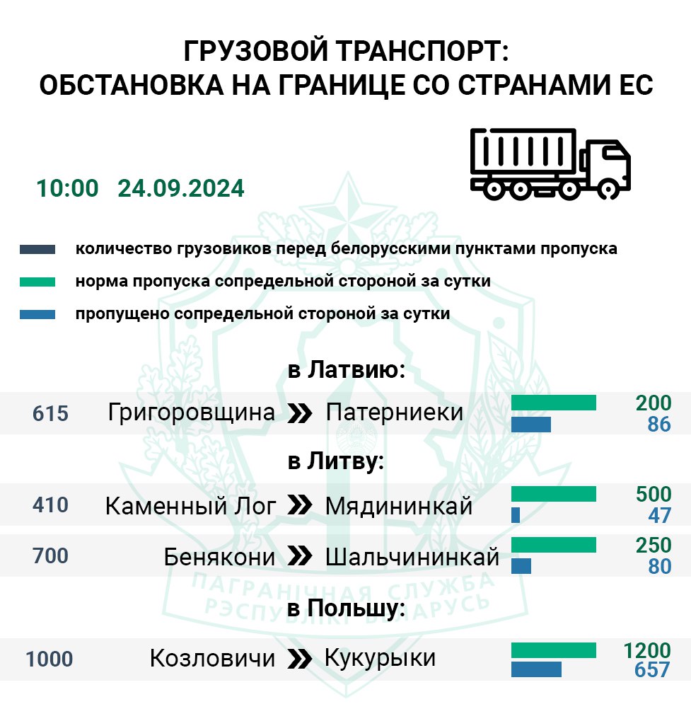 По состоянию на 10:00 2730 единиц грузового транспорта ожидают въезда в ЕС. Меньше всего фур за 24 часа проследовало в Литву через литовский Мядининкай (Каменный Лог), его контрольные службы оформили всего 47 из 500 авто возможных.