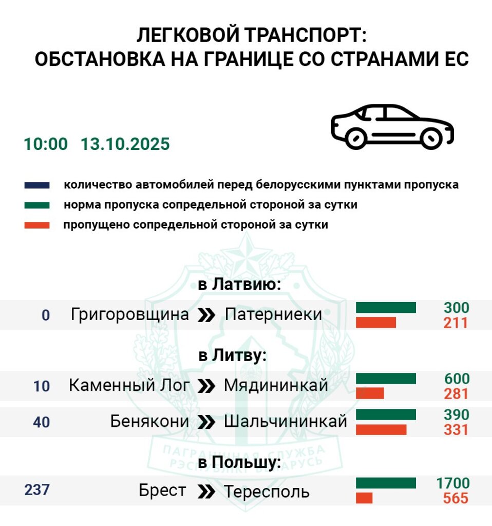 Въезда в Литву перед «Мядининкаем» (сопредельный «Каменный Лог») ожидают 10 авто, перед «Шальчининкаем» (сопредельный «Бенякони») — 40. Литовские пункты пропуска приняли из Беларуси 42% и 65% легковушек от нормы соответственно.