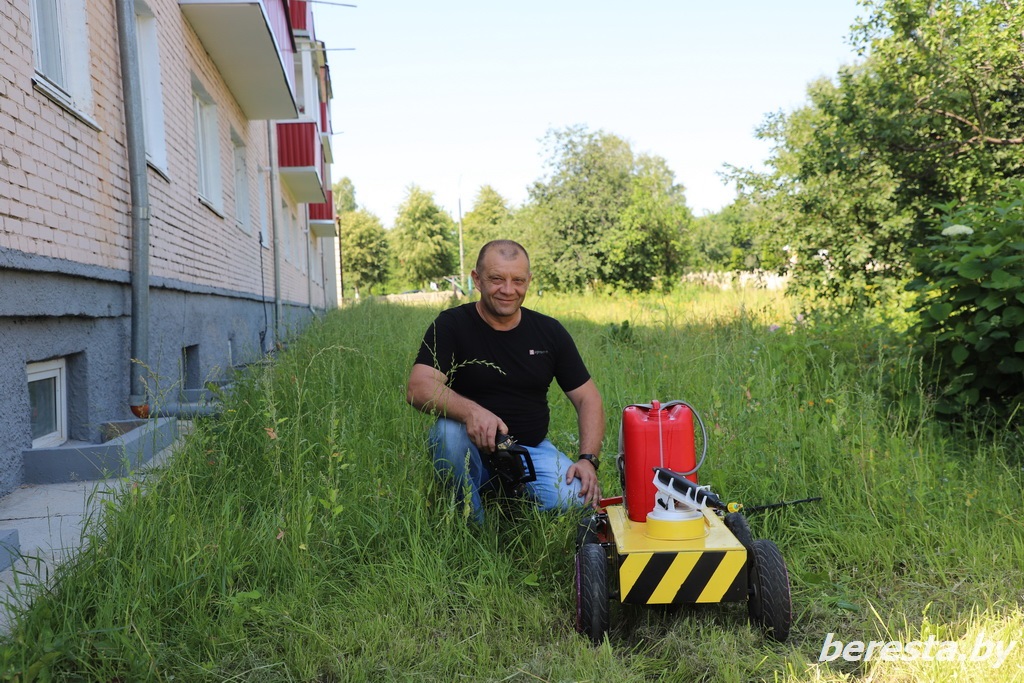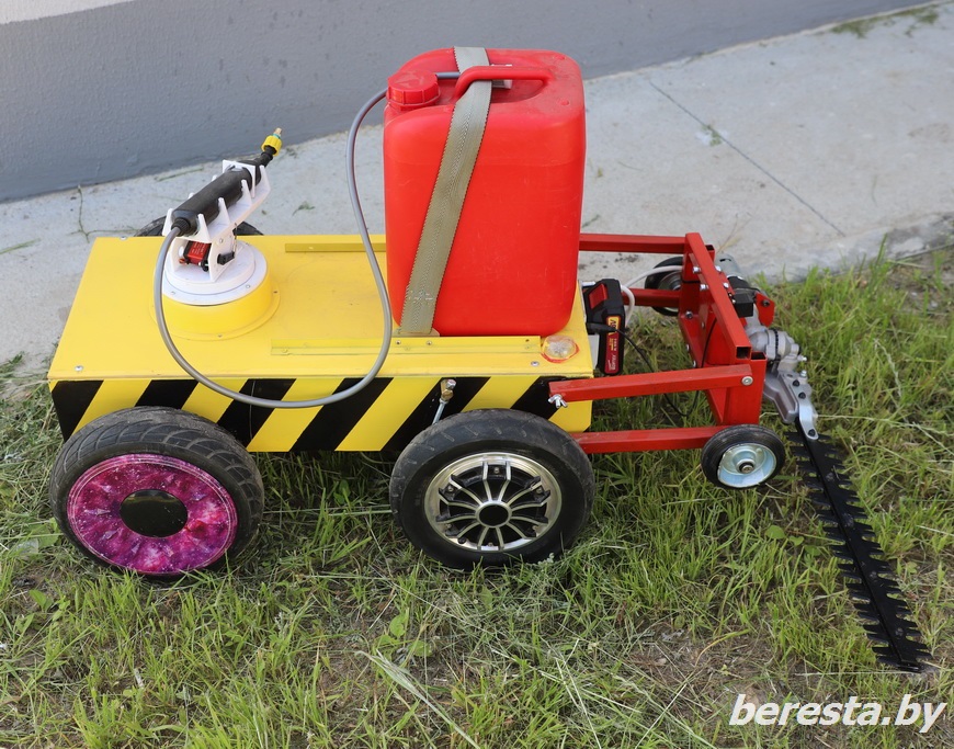 Еще одно ноу-хау, разработка этого года – это агроробот для борьбы с борщевиком. Все мы знаем, что растение это очень ядовитое, его сок при попадании на кожу вызывает ожог. Работать, уничтожая растение, нужно в специальном прорезиненном костюме.  Представьте, на улице жара + 30, и на вас такой костюмчик! Не очень, правда? А вот здесь чудо-робот нам в помощь! Модель управляется с пульта, на ней есть жатка (похожа на бензопилу), которая механически уничтожает борщевик, и канистра с системой полива – остатки борщевика дополнительно обрабатываются химикатами. Вот так вот!