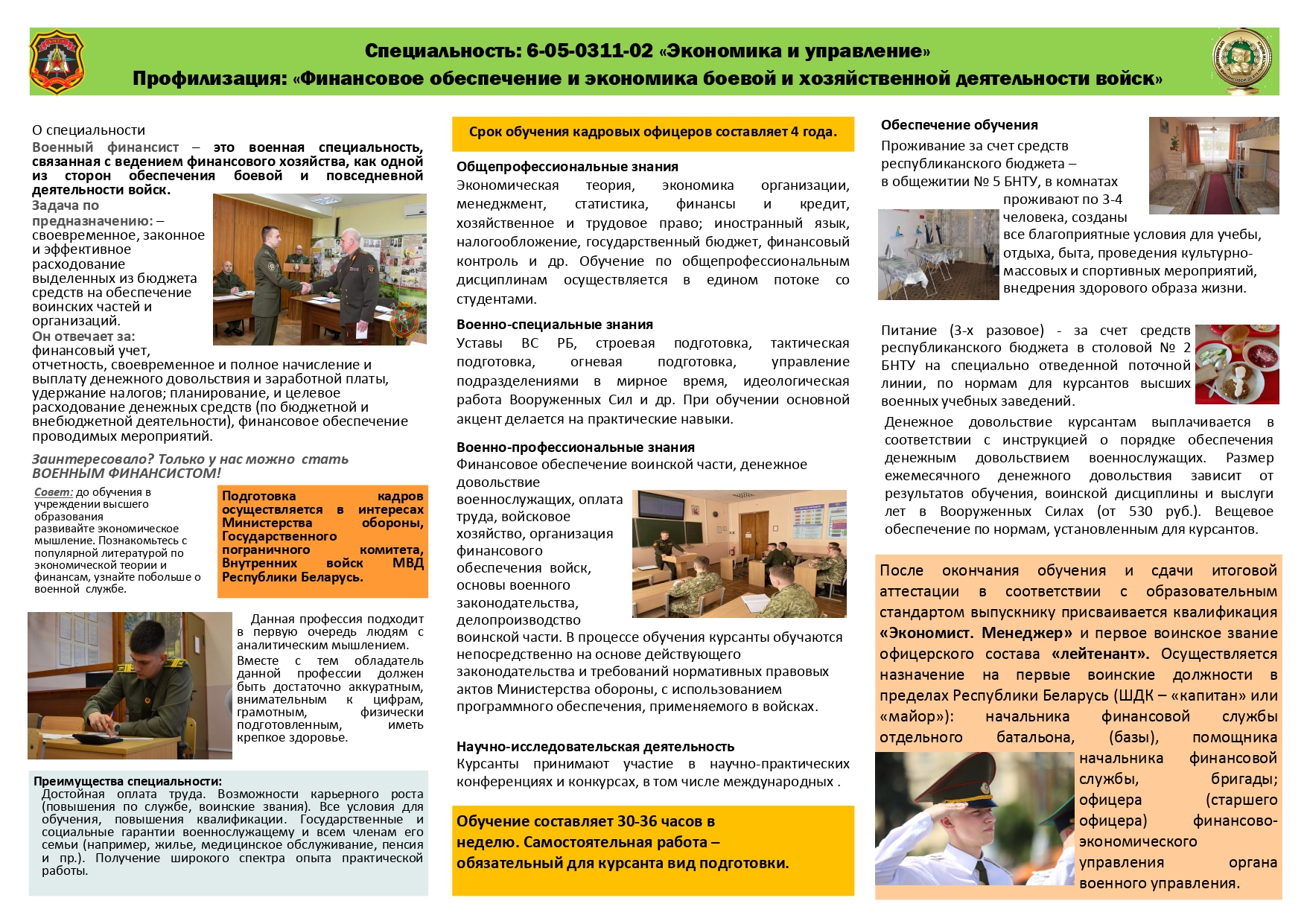 В Беларуси функционирует четко выстроенная система подготовки офицерских кадров как для Вооруженных Сил, так и для других силовых ведомств нашей страны. У абитуриентов всегда есть выбор той или иной военной специальности. Одна из востребованных — военный финансист.