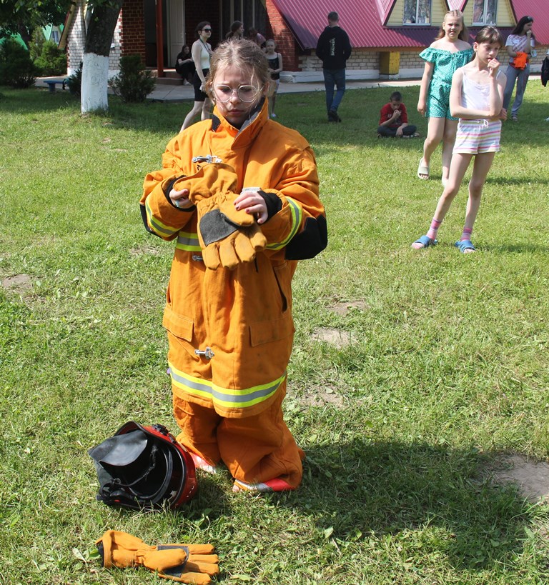 В продолжение мероприятий спасатели организовали показ аварийно-спасательной техники и оборудования, предоставили возможность примерить одежду пожарного.