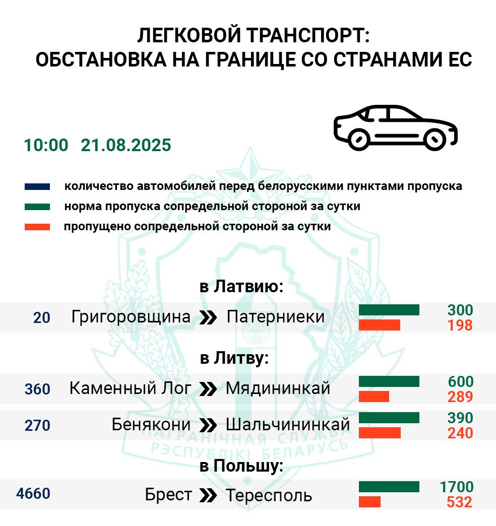 За 24 часа количество легкового транспорта, ожидающего въезда в Евросоюз перед польским пунктом пропуска Тересполь (Брест), увеличилось на 40 единиц и составляет 4 660 авто. При этом сопредельные контрольные службы замедлили оформление, снизив выполнение суточной нормы пропуска легковушек с 37% до 31%.