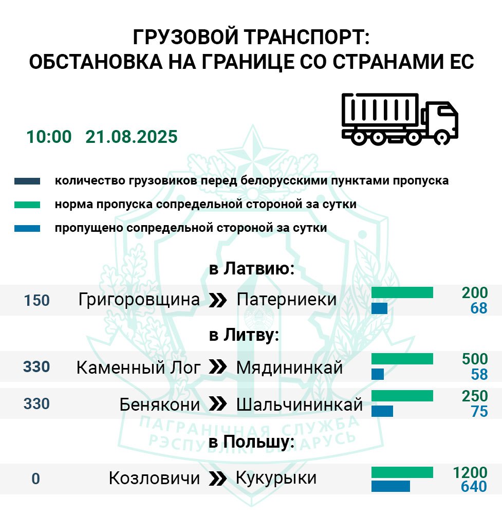 На литовском направлении за сутки фиксируется двукратный рост очереди легковых авто — с 290 до 630 единиц. Перед Мядининкаем (Каменный Лог) в ожидании находятся 360 автомобилей, перед Шальчининкаем (Бенякони) — 270. Сотрудники литовских пунктов пропуска за сутки приняли из Беларуси 55% легковушек от нормы соответственно.