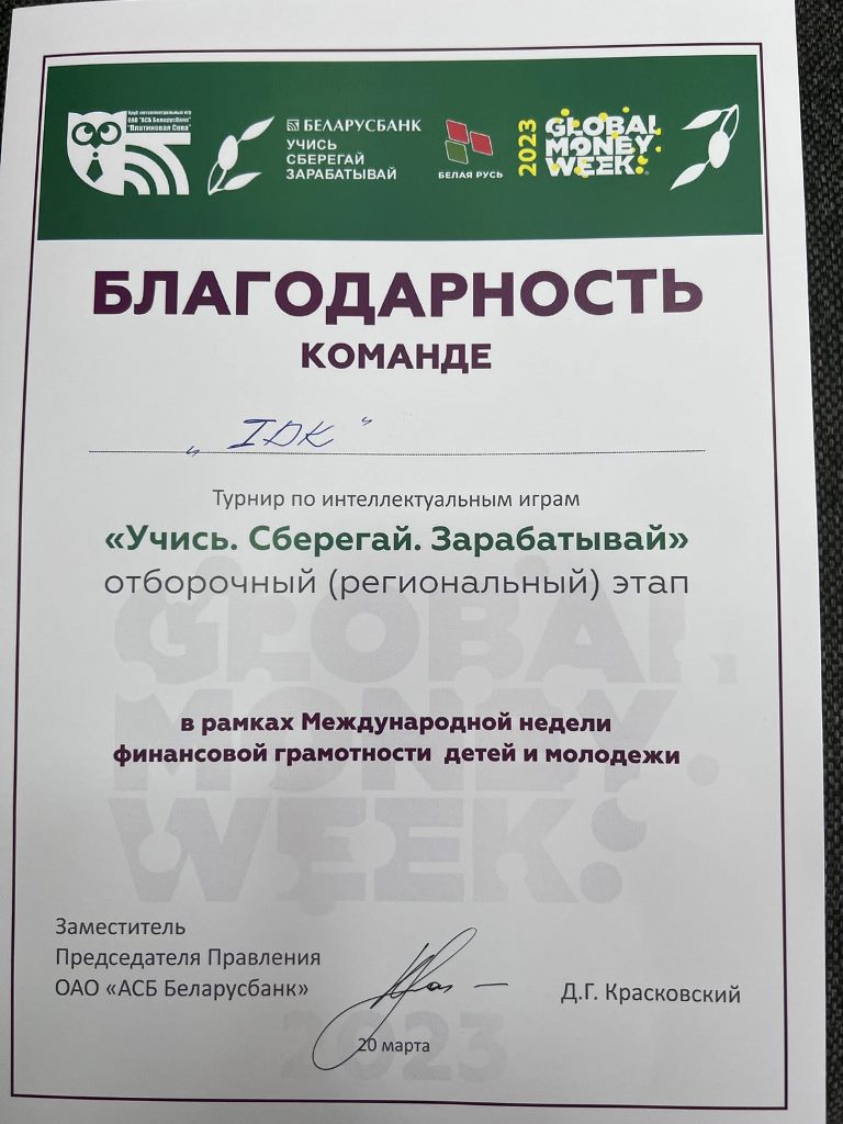 20 марта команда Большеберестовицкой средней школы в составе учащихся 10-11 классов Максима Агневского, Кирилла Жлабовича, Романа Пенчука, Алексея Рыгосика, Дениса Степанчука и Дениса Янковского приняла участие в областном интеллектуальном турнире «Учись. Сберегай. Зарабатывай», организованном АСБ «Беларусбанк» и Гродненской областной организацией республиканского общественного объединения «Белая Русь» в рамках Недели финансовой грамотности.