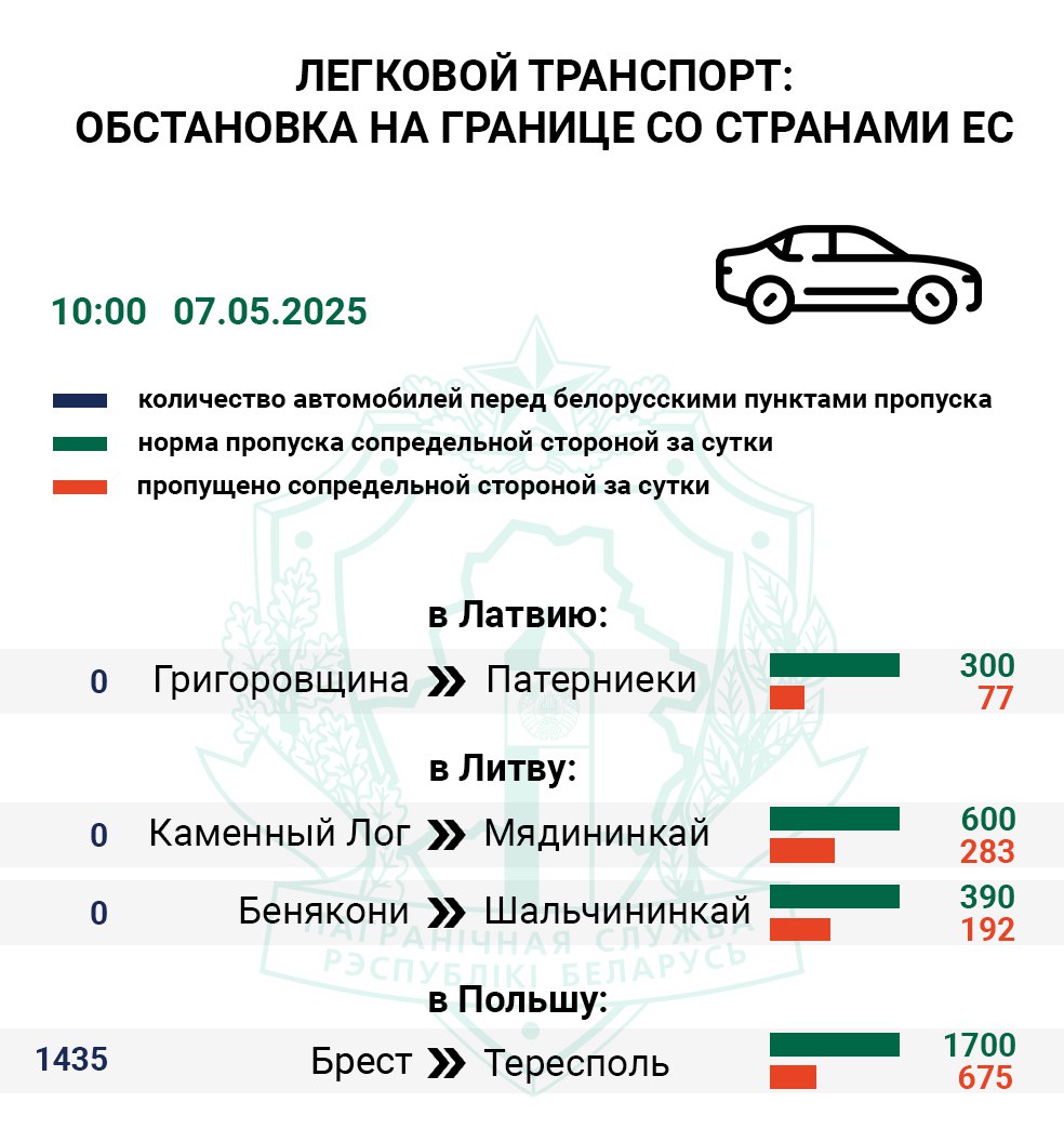 По состоянию на 10:00 въезда в польский пункт пропуска Тересполь (Брест) ожидают 1435 легковых автомобилей. За прошедшие сутки сопредельная сторона выполнила норму по пропуску авто из Беларуси на 40%. Также в очереди находятся 15 автобусов.