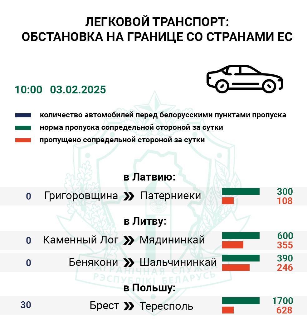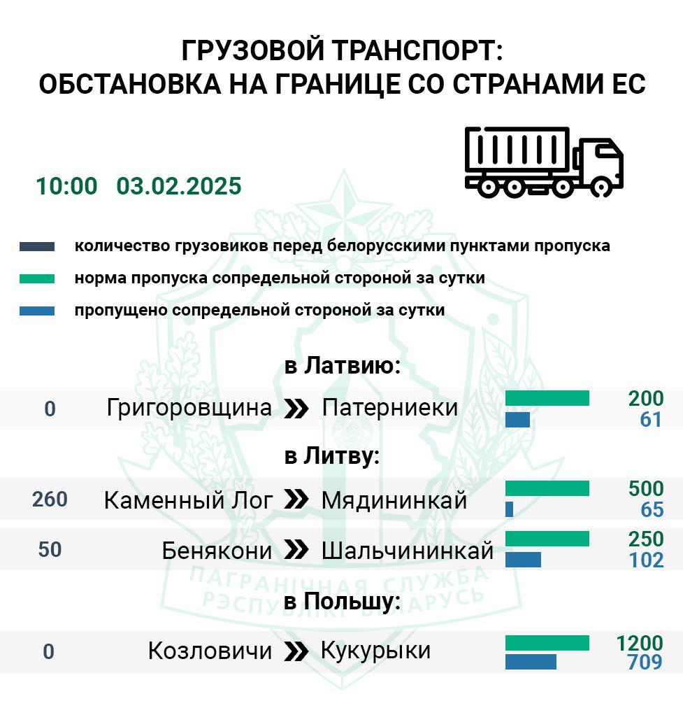 По состоянию на 10:00 самый загруженный маршрут в Евросоюз проходит через литовский пункт пропуска Мядининкай (Каменный Лог). Перед данным погранпереходом въезда на сопредельную территорию ожидают более 260 большегрузов, его контрольные службы с пятницы пропустили только 14% транспорта от нормы, т.е. 3 из 20 фур в час.