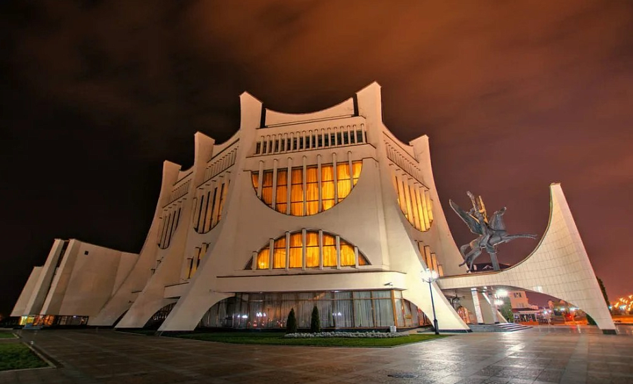 Таким будущий театр задумал его архитектор Геннадий Мочульский. Правда, уже после утверждения проекта он изменил внешний облик театра, сделав его менее строгим и более изящным.