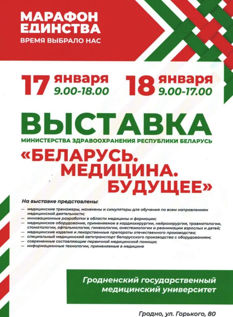 Выставка Минздрава «Беларусь. Медицина. Будущее», на которой представят достижения здравоохранения Гродненской области, будет работать 17-18 января в Гродно во время общественно-культурной акции «Марафон единства», сообщила корреспонденту БЕЛТА начальник главного управления здравоохранения Гродненского облисполкома Людмила Кеда.