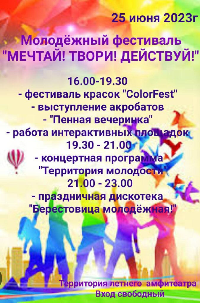 25 июня на территории летнего амфитеатра в г. п. Б. Берестовица состоится молодежный фестиваль «Мечтай. Твори. Действуй!» Начало в 16.00. Приглашаем!