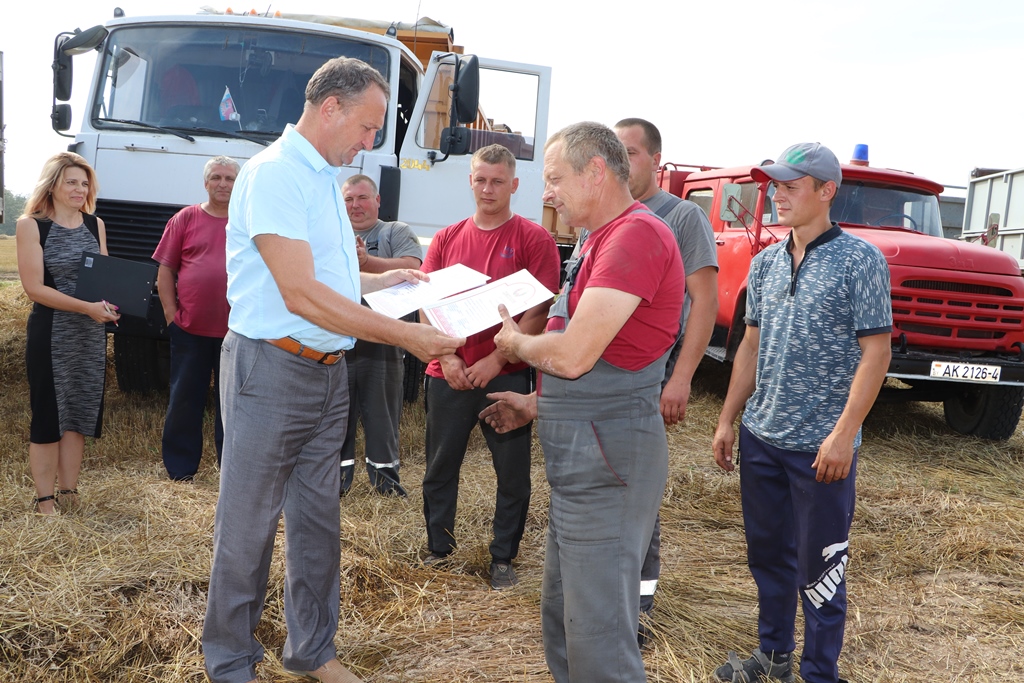 2 тысячи тонн зерна нового урожая перевезли к этому времени уже водители Сергей Хейлик (КСУП «Пограничный-Агро»), Виталий Ляхович (КСУП «Воронецкий), Александр Кузьмицкий (СУП «МилкАгро»), Валерий Колесник (РСУП «Олекшицы»), Анатолий Каневский (РУСП «Массоляны») и молодой водитель Максим Воронцов (РСУП «Олекшицы»).
