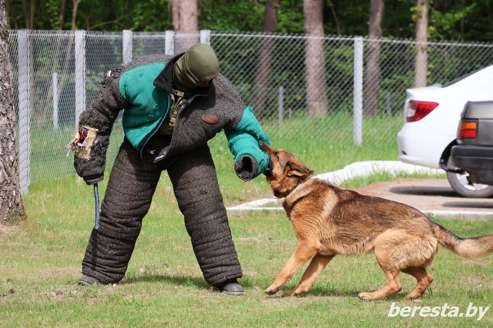 Вот боец переоделся в толстый ватник. Сейчас его будут «гонять» по полю. Обязанность эта легла на четвероногого пограничника – немецкую овчарку Абриса, на счету которого более 500 успешных задержаний нарушителей.