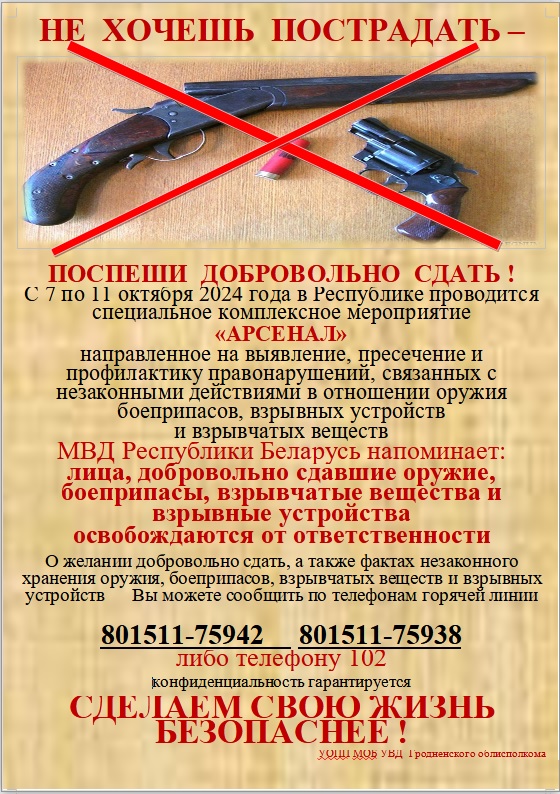 Лица, желающие добровольно сдать оружие и боеприпасы, либо предоставить информацию о гражданах, незаконно владеющих оружием могут обратиться в Берестовицкий РОВД по телефонам 75-9-38, 75-9-42 либо 102. Конфиденциальность гарантируется.