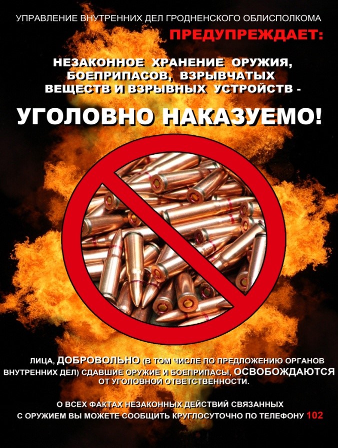 Владение незарегистрированным оружием, боеприпасами к нарезному оружию, взрывчатыми предметами и веществами предусматривает уголовную ответственность согласно ст. 295 УК РБ. Хотелось бы обратить внимание, что хранение даже незначительного количества патронов пригодных для производства выстрела уже образуют состав преступления и влечет уголовную ответственность. В то же время лицо, добровольно сдавшее оружие, боеприпасы и взрывчатые вещества и предметы согласно примечания ст. 295 УК РБ освобождается от уголовной ответственности.