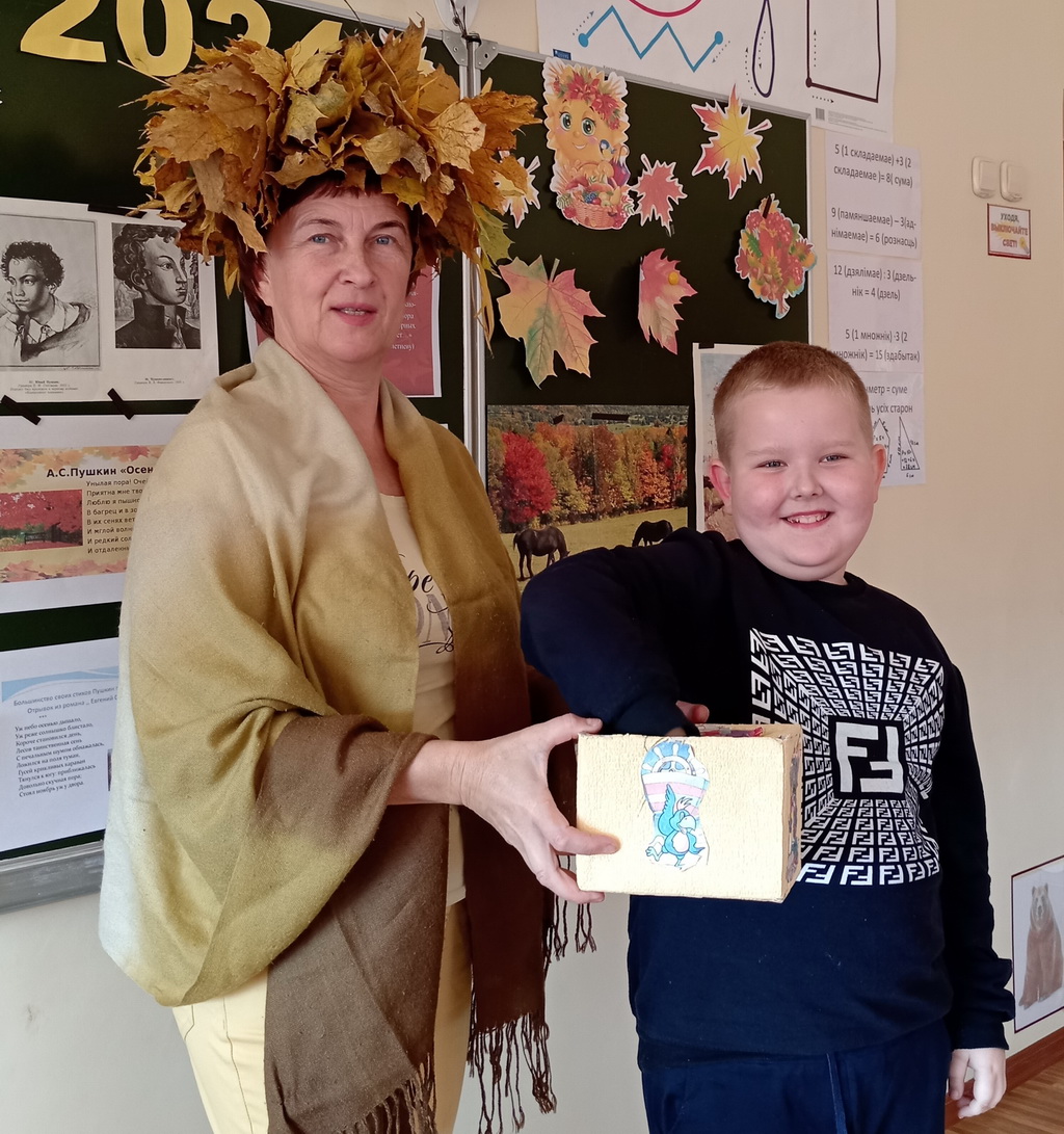Максим: «Сегодня у нас был конкурс чтецов «Унылая пора! Очей очарованье…» Все ребята участвовали в нем. Звучали стихи на русском и белорусском языке об осени. Наш воспитатель Ирина Николаевна подобрала яркие картинки и красивую музыку. За участие в конкурсе королева Осень угостила нас вкусными и полезными лакомствами. Было здорово!»