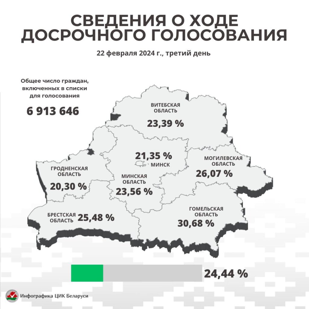 По информации ЦИК за три дня в досрочном голосовании на выборах депутатов приняли участие 24,44 % от общего числа граждан, которые включены в списки для голосования.