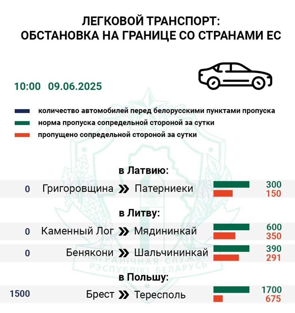 Перед единственным доступным для легковушек польским пунктом пропуска Тересполь (Брест) фиксируется 1500 единиц авто и 20 автобусов. В субботу очередь на въезд в Польшу достигла 1922 легковушек. Сопредельная сторона за два дня приняла на свою территорию 36% авто от нормы.