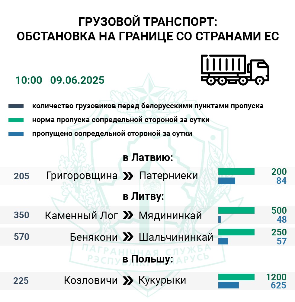 Литовское направление остается самым загруженным для фур. Перед погранпереходами Шальчининкай (Бенякони) и Мядининкай (Каменный Лог) фиксируется 920 грузовиков, ожидающих въезда на сопредельную территорию. Через данные пункты пропуска в Литву проследовало всего 18% авто от нормы.