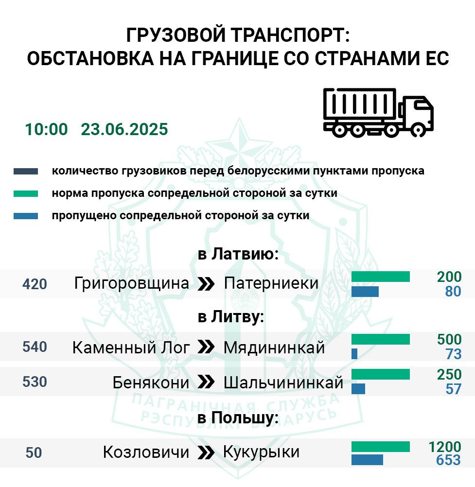 Скопление большегрузов также фиксируется перед латвийским погранпереходом Патерниеки (Григоровщина). Его сотрудники с пятницы приняли на свою территорию 35% грузовиков от нормы. Въезда в Евросоюз ожидают 420 фур.
