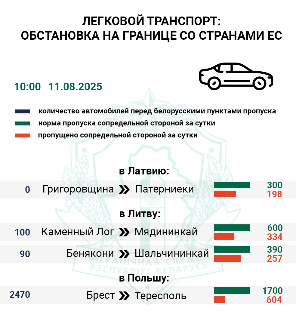 Перед единственным доступным для легковушек польским пунктом пропуска Тересполь (Брест) фиксируется 2 470 единиц авто и 55 автобусов. В субботу очередь на въезд в Польшу достигла 2 630 легковушек. Сопредельная сторона за два дня приняла на свою территорию 35% авто от нормы.