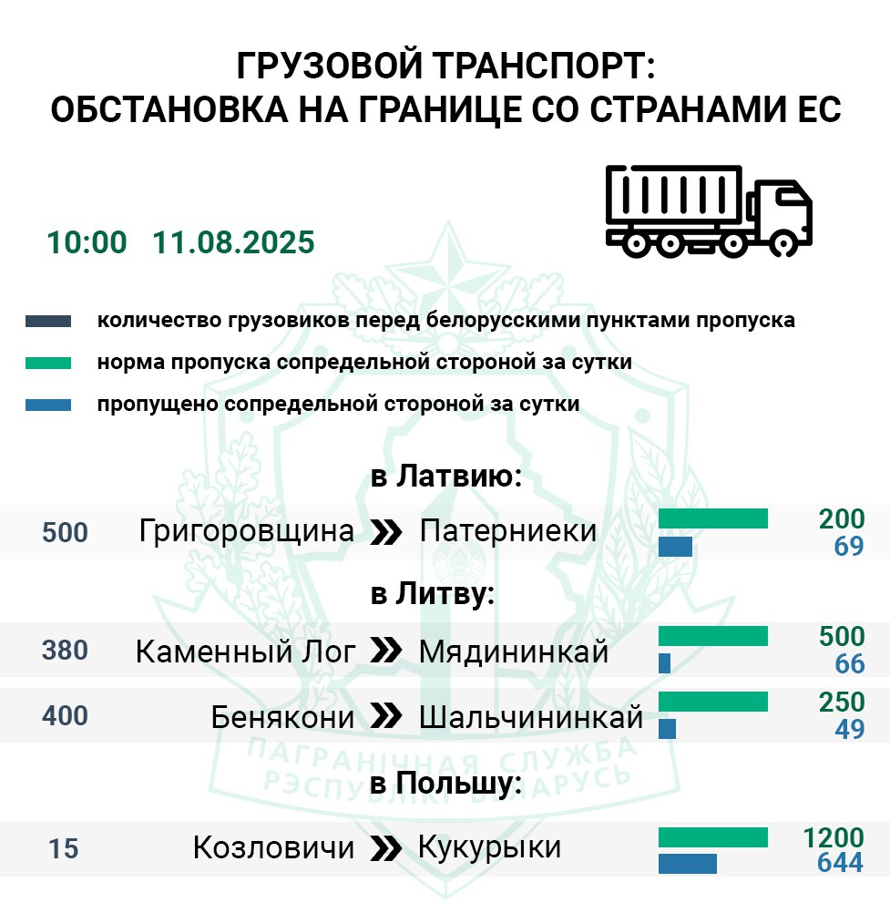 Литовское направление остается самым загруженным для фур. Перед погранпереходами Шальчининкай (Бенякони) и Мядининкай (Каменный Лог) фиксируется 780 грузовиков, ожидающих въезда на сопредельную территорию. Через данные пункты пропуска в Литву проследовало всего 19% авто от нормы.