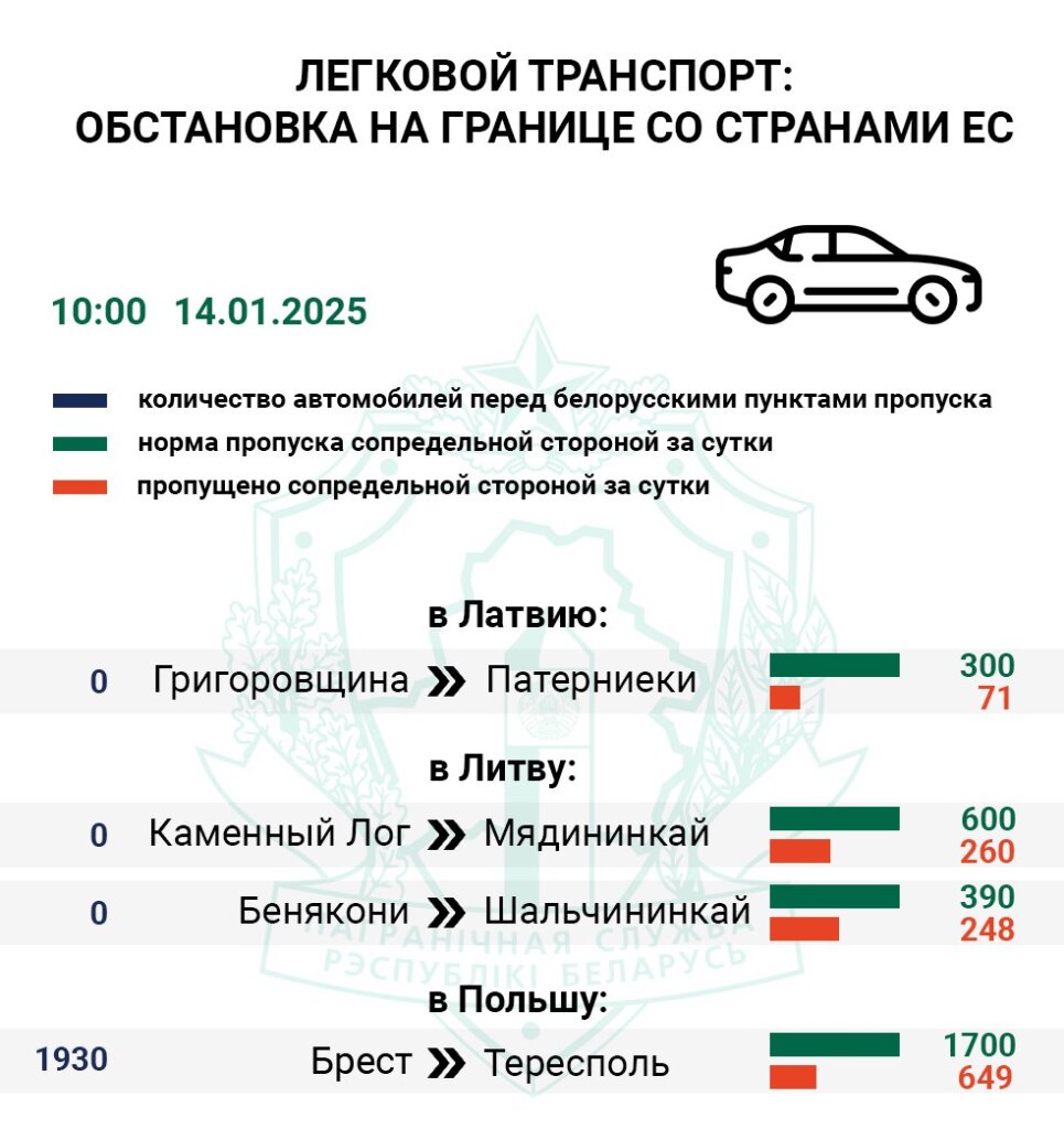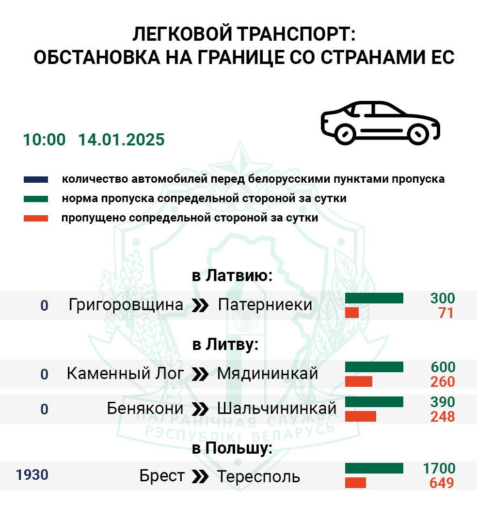 Количество легковых транспортных средств перед польским пунктом пропуска Тересполь (Брест) составляет 1930 единиц. Сопредельная сторона продолжает принимать на свою территорию не более 40% авто от нормы. Перед указанным погранпереходом въезда в Польшу ожидают более 10 автобусов.