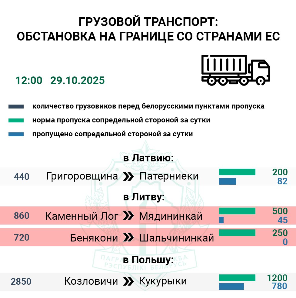 Самый загруженный маршрут для грузовиков проходит через польский погранпереход Кукурыки (Козловичи) — 2 850 единиц. Сопредельная сторона выполнила норму по пропуску транспорта только на 65%.