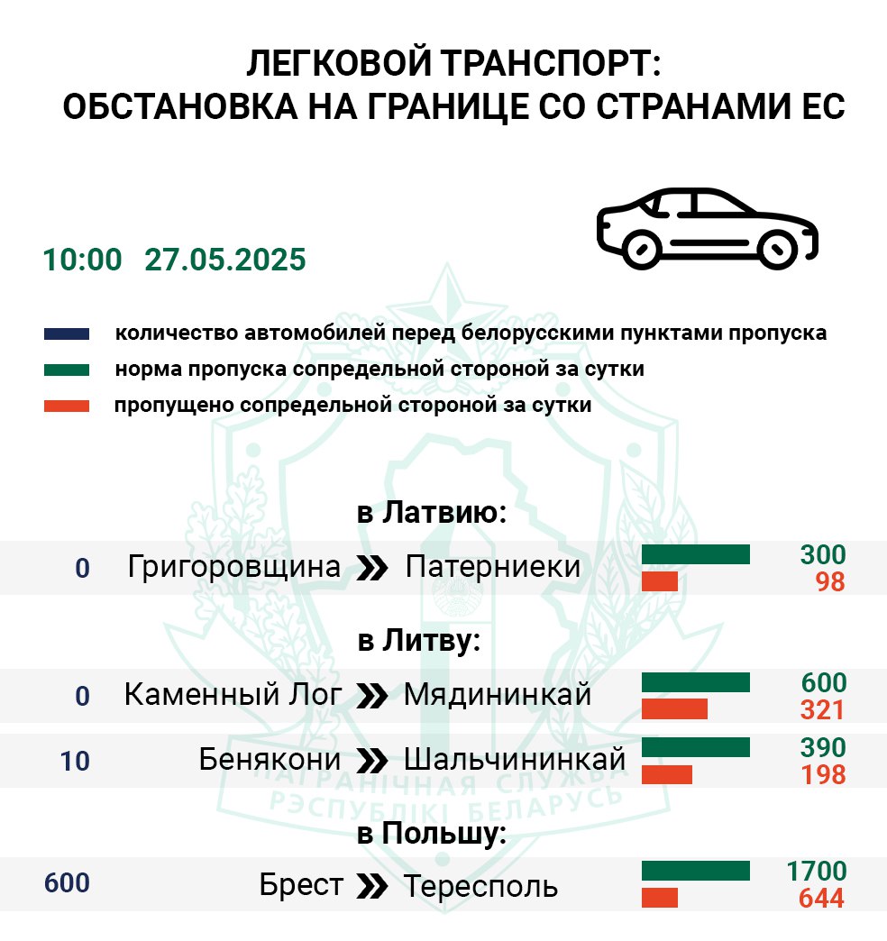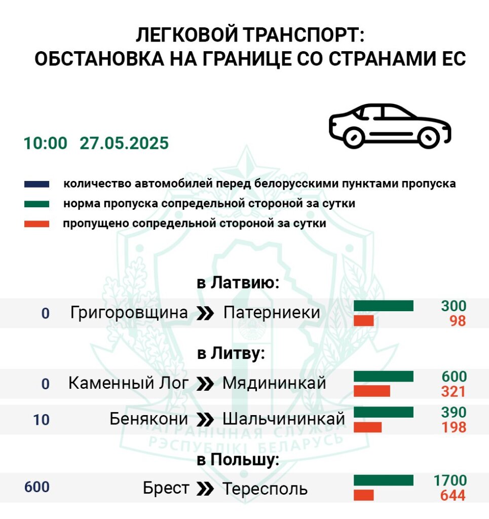 По состоянию на 10:00 въезда в польский пункт пропуска Тересполь (Брест) ожидают 600 легковых автомобилей и 30 автобусов. За прошедшие сутки сопредельная сторона выполнила норму по пропуску авто из Беларуси на 59%.
