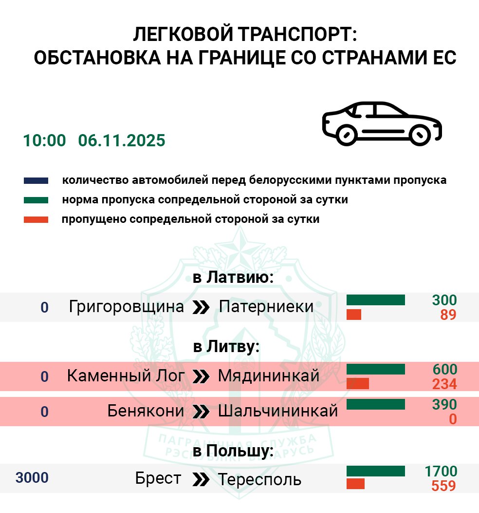 Перед единственным доступным для легковушек польским погранпереходом Тересполь (Брест) фиксируется 3 000 единиц авто и 155 автобусов. Сопредельная сторона за сутки приняла на свою территорию 33% автомобилей от нормы.
