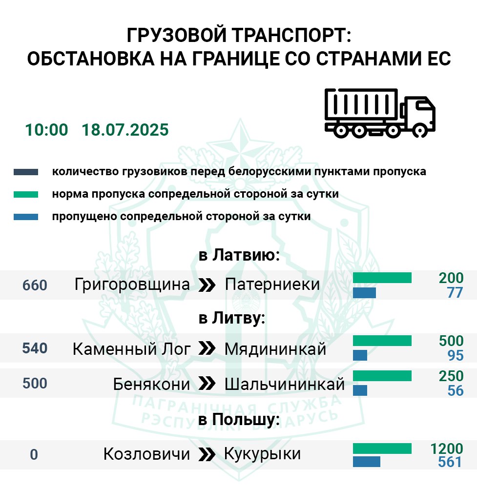 Самым загруженным погранпереходом для фур остается латвийский Патерниеки (Григоровщина) — 660 грузовиков. С начала недели сопредельная сторона приняла на свою территорию всего 35% транспорта.