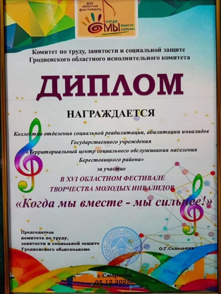 В преддверии Дня инвалидов Республики Беларусь, в Сморгони состоялся XVI областной фестиваль творчества молодых инвалидов «Когда мы вместе − мы сильнее!». Свои вокальные, танцевальные и актерские таланты смогли продемонстрировать более 200 участников из разных уголков Гродненщины. Среди них и коллектив отделения социальной реабилитации, абилитации инвалидов ТЦСОН Берестовицкого района.