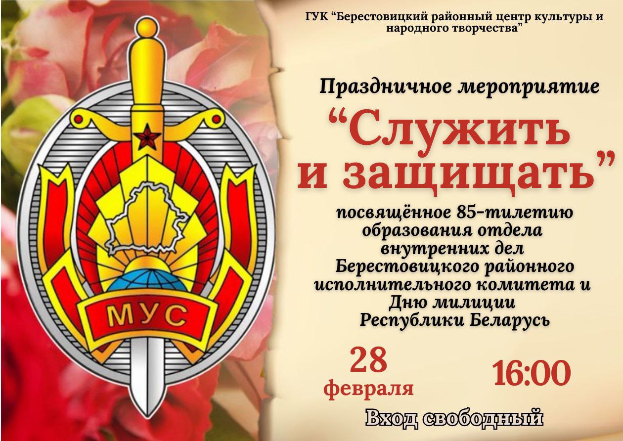 28 февраля в 16.00 в Берестовицком районном центре культуры и народного творчества пройдет праздничное мероприятие «Служить и защищать», посвященное 85-летию образования отдела внутренних дел Берестовицкого районного исполнительного комитета и Дню милиции Республики Беларусь.