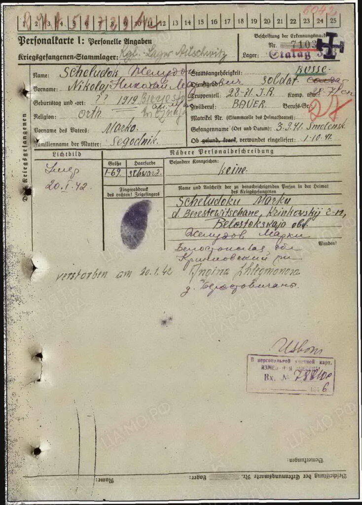 Что известно о Николае Желудке? Он родился в 1919 году в деревне Берестовичаны. В мае 1941 года был призван на срочную службу в армию и там встретил Великую Отечественную войну. До сестры Марии доходили слухи, что он воевал где-то под Москвой. И действительно, как стало известно, Николай Маркович был пленен в ходе Смоленского сражения в 1941 году. Помещен в концентрационный лагерь Освенцим, известный как Аушвиц. Через пару месяцев – 20 января 1942 года – Николай умер.