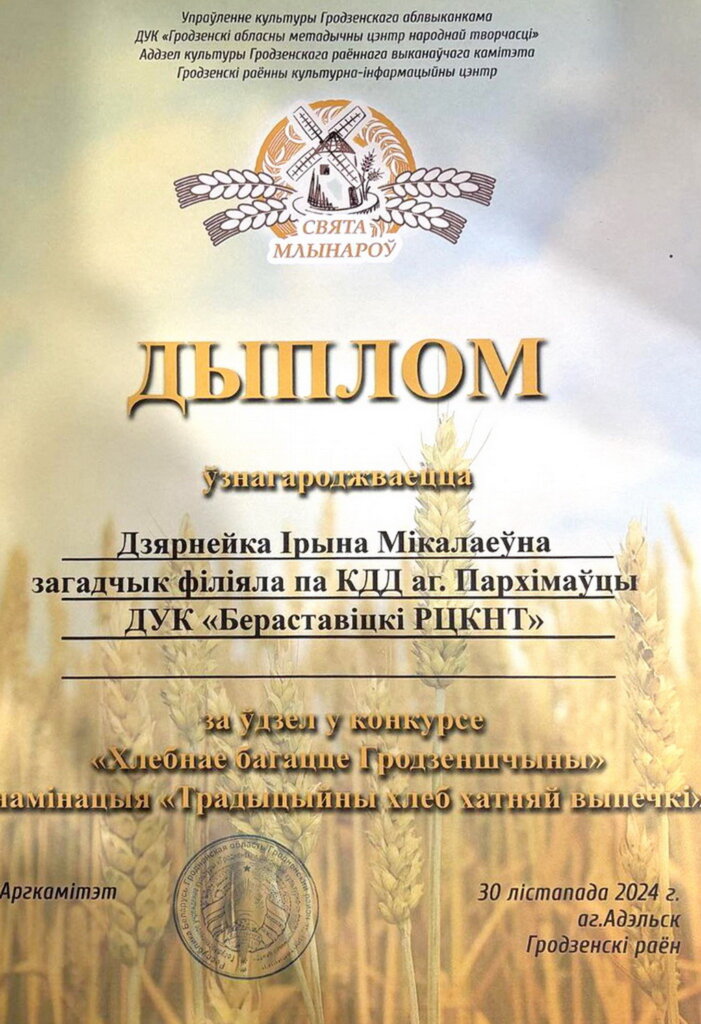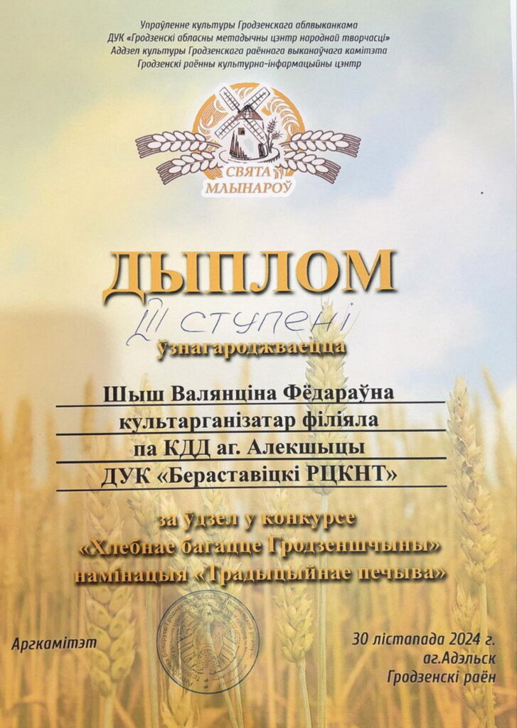 Работнікі Бераставіцкага раённага цэнтра культуры і народнай творчасці – культарганізатар філіяла па культурна-дасугавай дзейнасці аг. Алекшыцы Валянціна Шыш і загадчык філіала па культурна-дасугавай дзейнасці аг. Пархімаўцы Ірына Дзярнейка прадставілі на свяце свае кулінарныя вырабы ў намінацыі “Традыцынае печыва” конкурса “Хлебнае багацце Гродзенщыны”. За ўнікальнасць, прыгажосць і, вядома ж, смак сваёй конкурснай работы Валянціна Фёдараўна ўзнагароджана дыпломам ІІІ ступені. Ірына Мікалаеўна атрымала дыплом за ўдзел.
