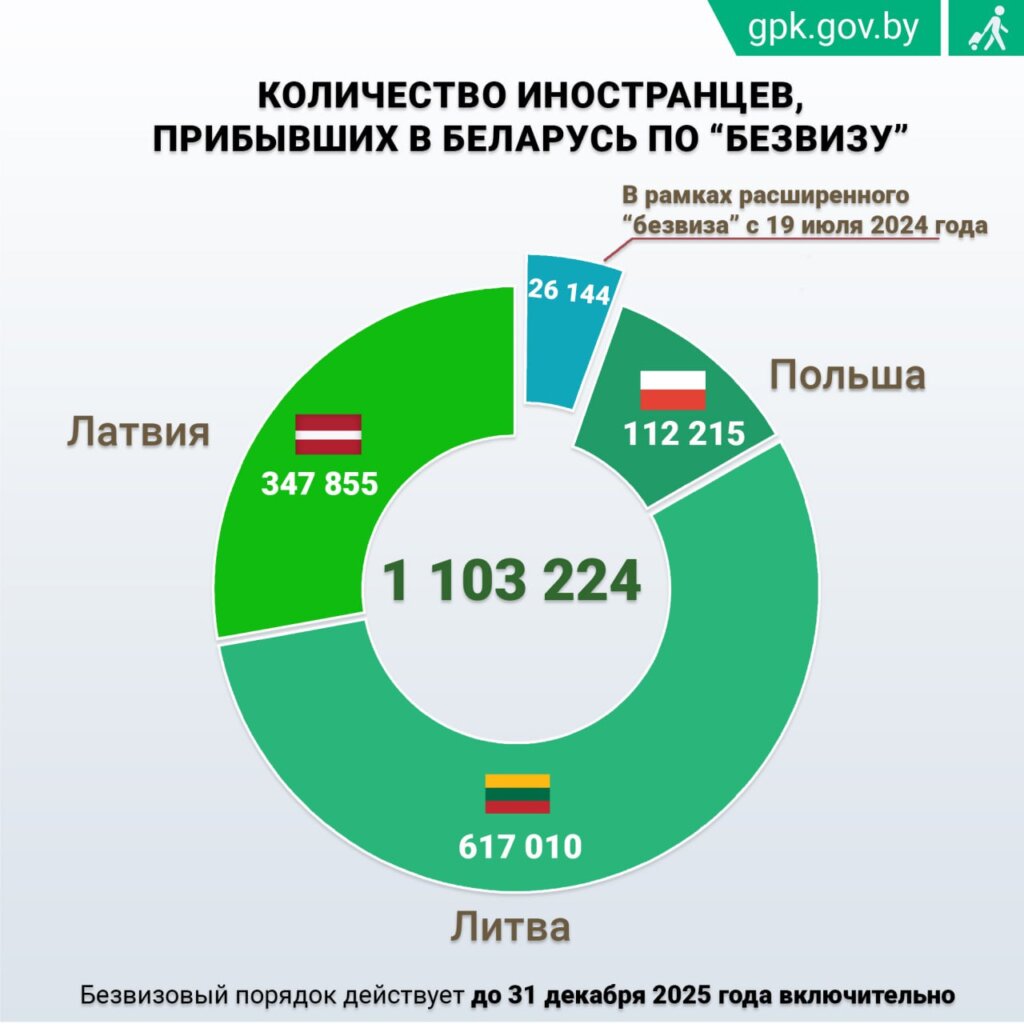 Всего с 15 апреля 2022 года нашу страну посетили 1 103 224 жителя Европы. Из Латвии прибыло 347 855 иностранцев, из Литвы — 617 010, из Польши — 112 215. В рамках расширенного «безвиза» для 35 европейских государств с 19 июля 2024 года в Беларусь проследовало 26 144 иностранных гражданина.
