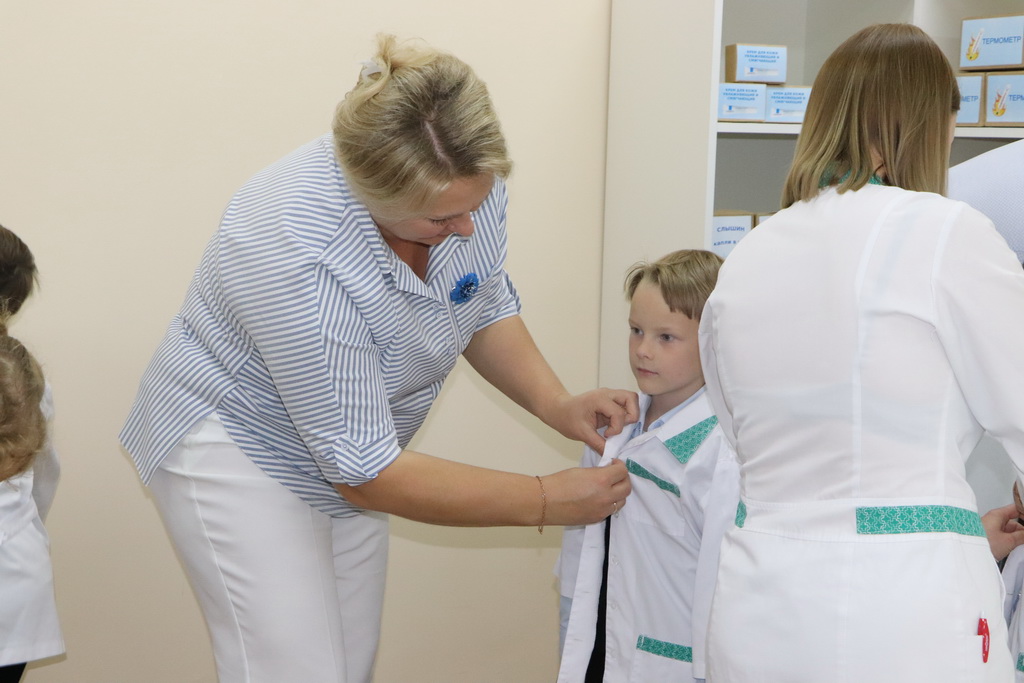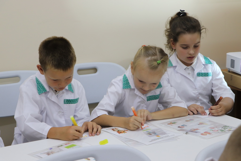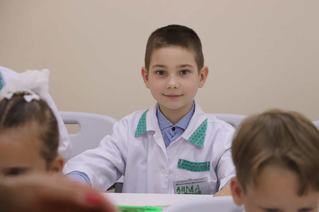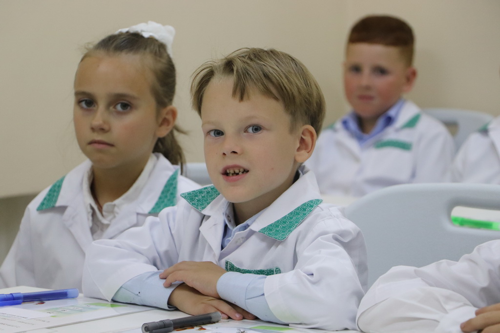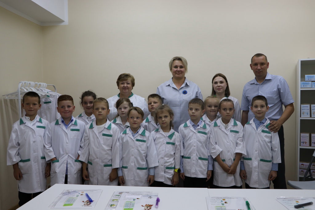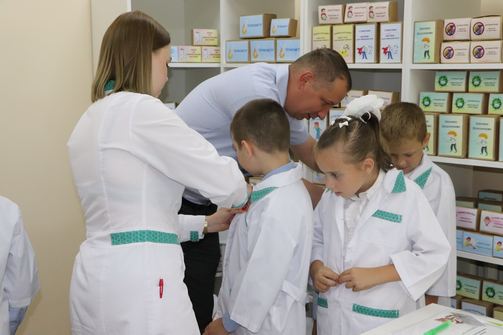 Необычный урок в «Школе юного фармацевта» начался с увлекательного погружения в профессию. Ребятам предложили надеть белые халаты и подготовить себе бейджи – все как у настоящих работников аптеки.