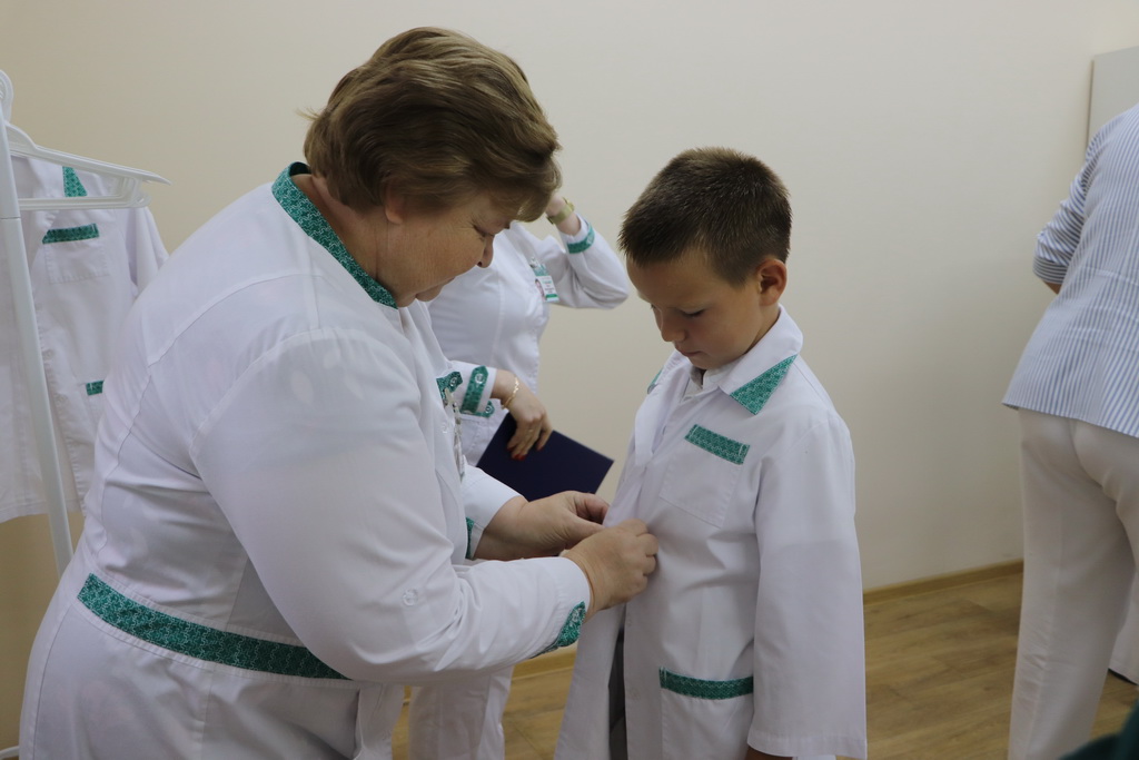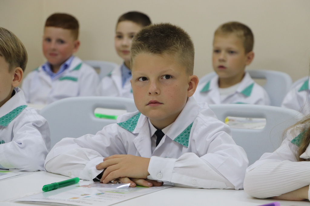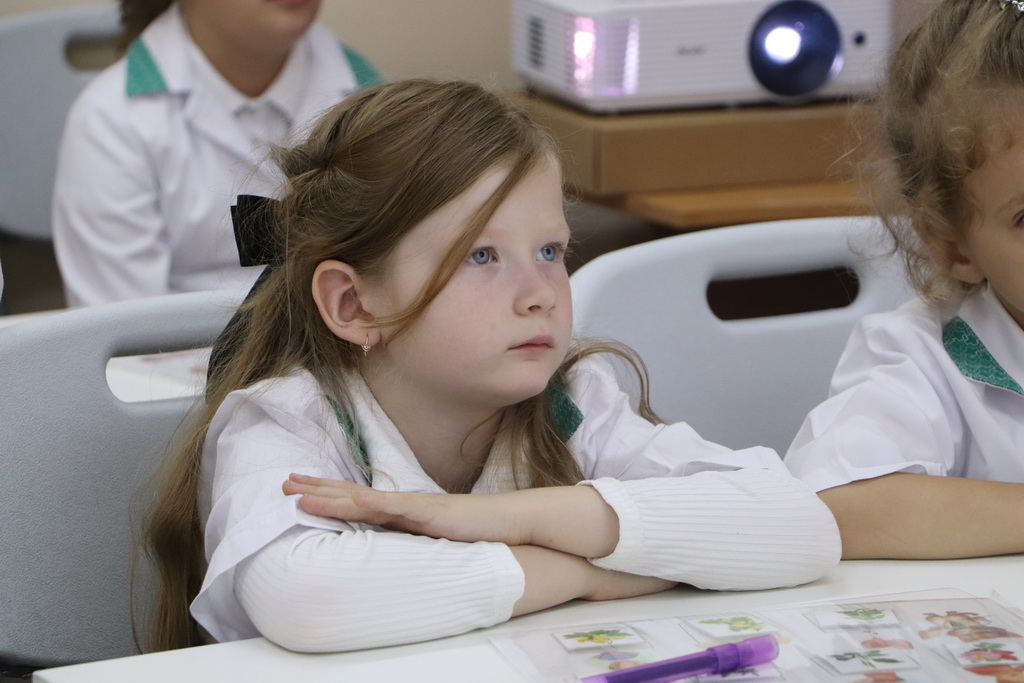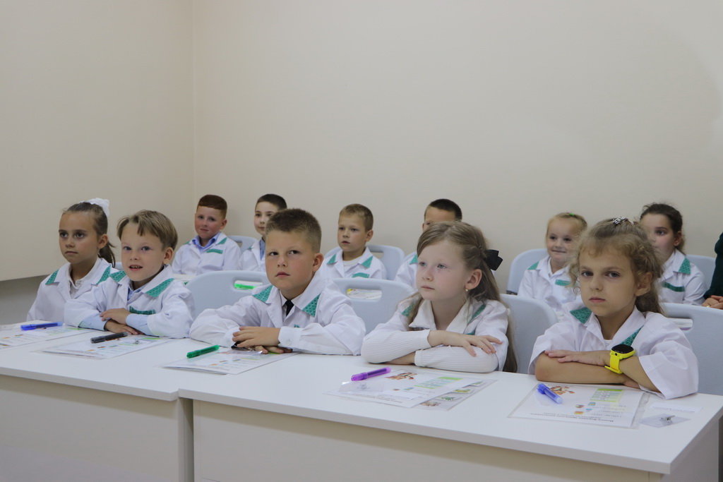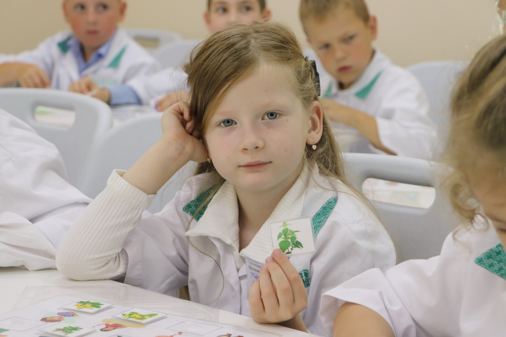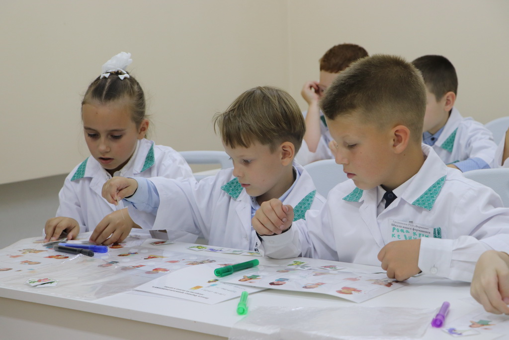 Необычный урок в «Школе юного фармацевта» начался с увлекательного погружения в профессию. Ребятам предложили надеть белые халаты и подготовить себе бейджи – все как у настоящих работников аптеки.