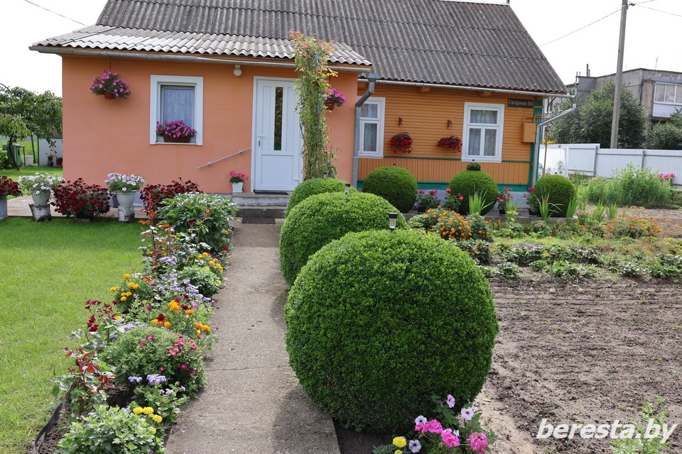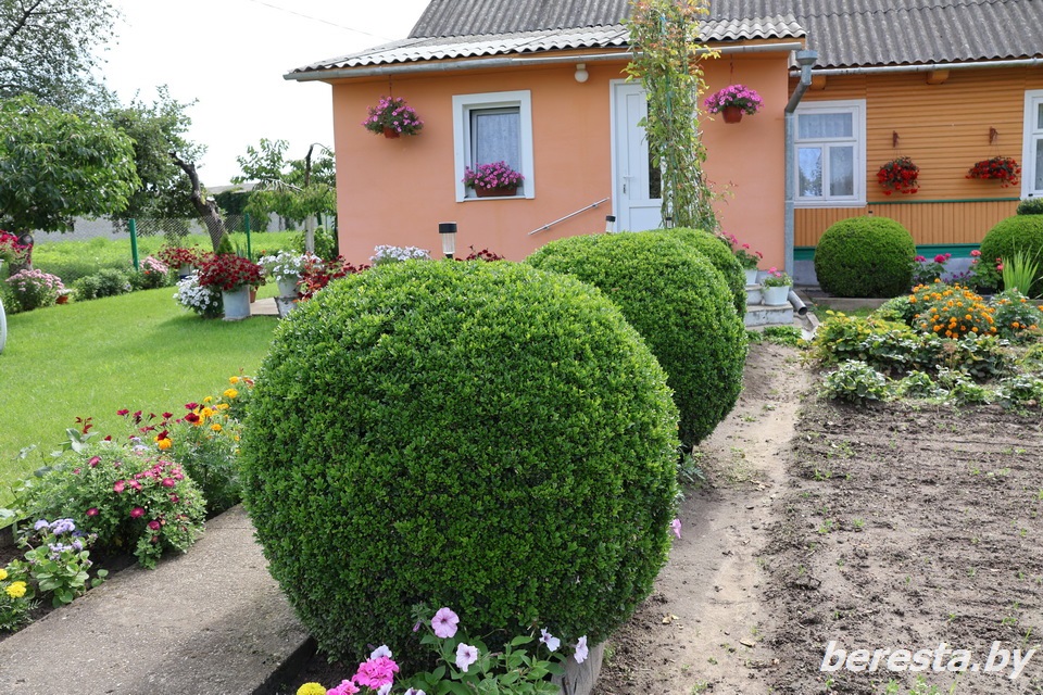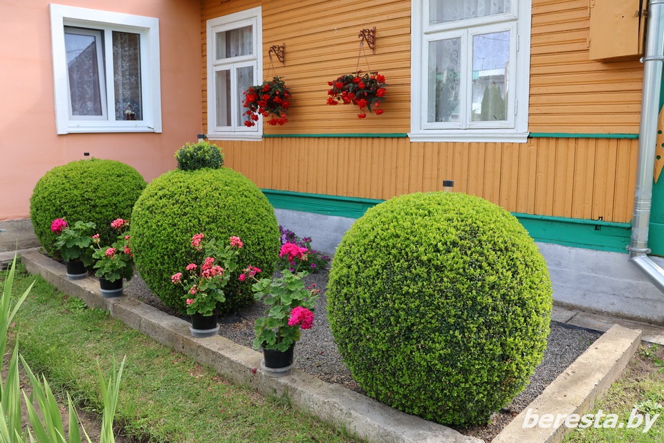 На придомовом участке Иодковских невозможно не заметить огромные самшитовые шары, которые видны даже с дороги. Кусты самшита растут здесь уже более десяти лет. Впервые форму шара придал кустарникам брат Малгожаты Казимировны. Сейчас «модной стрижкой» самшита занимается она сама, даже приобрела электрический кусторез, поэтому дело спорится мастерски быстро.