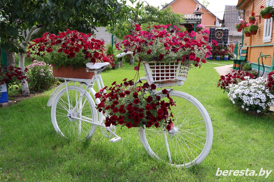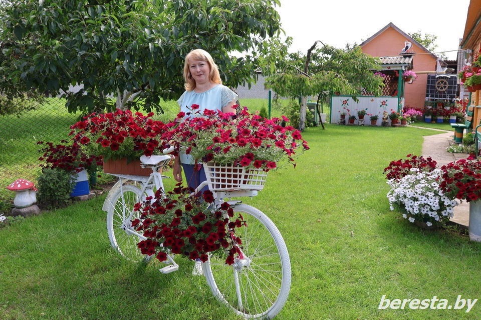Со временем часть огорода заменили газоном. Сначала участок земли засеяли травой, а потом уже стали появляться цветочные композиции. Недавно здесь обосновался велосипед с горшками огромных петуний, который смотрится очень эффектно. Кстати, с петуньями наша героиня подружилась не сразу.