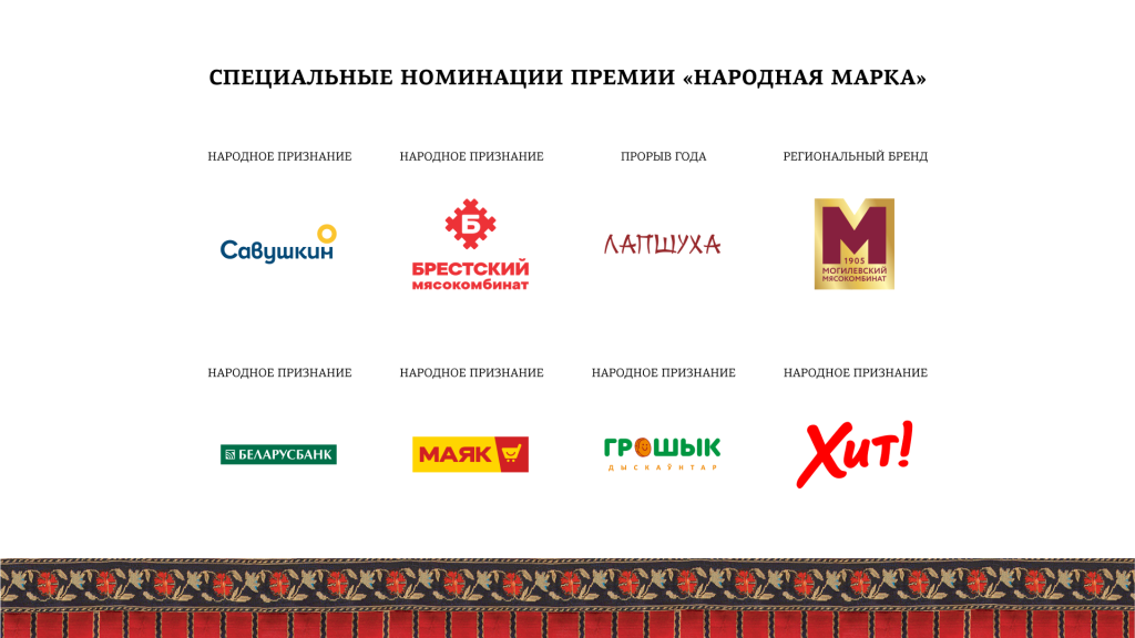 Из года в год уровень брендового сознания белорусских потребителей растет: в течение многих лет по признанию потребителей в большинстве номинаций Премии «Народная Марка» лидируют товары и услуги, произведенные в Беларуси. Покупатели с радостью отдавали свои голоса в поддержку отечественных производителей, тем самым демонстрируя доверие и любовь к их продукции, и этот год не исключение.