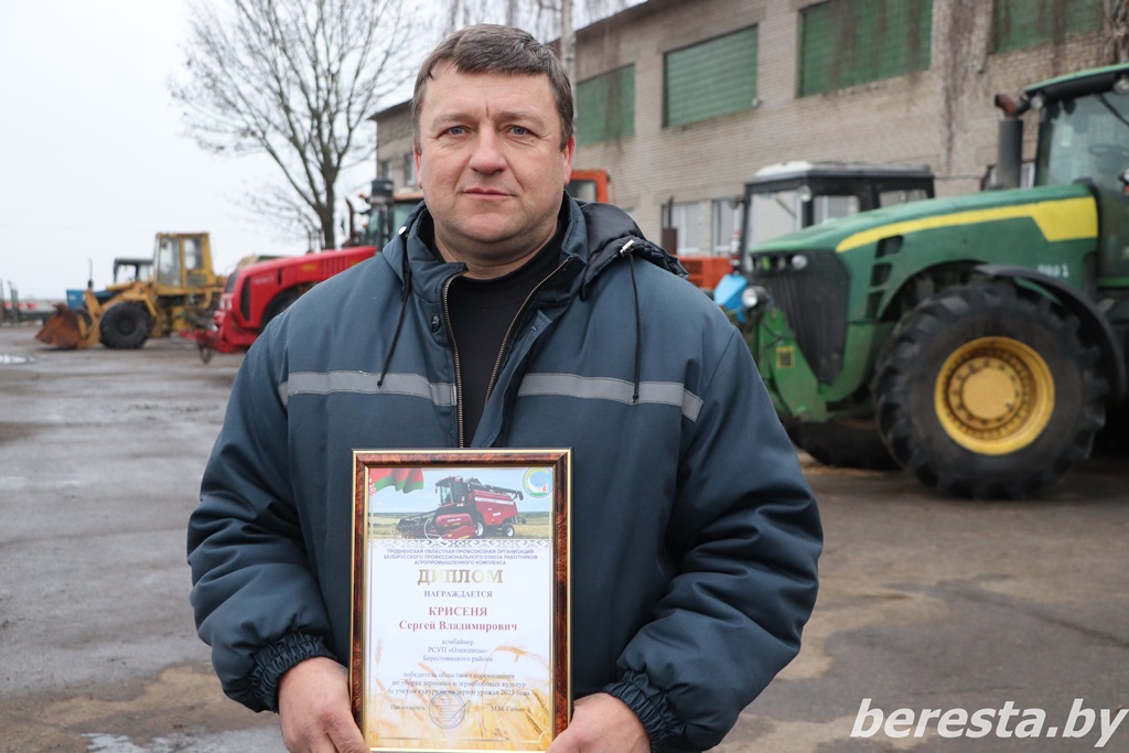 Высокие результаты Сергея Крисени не остались незамеченными. Председатель Берестовицкого райкома профсоюза работников агропромышленного комплекса Владимир Онищик приехал в РСУП «Олекшицы», чтобы вручить лидеру по намолотам в районе Диплом Гродненской областной профсоюзной организации Белорусского профессионального союза работников агропромышленного комплекса и денежное вознаграждение как победителю областного соревнования на уборке зерновых и зернобобовых культур в 2025 году.