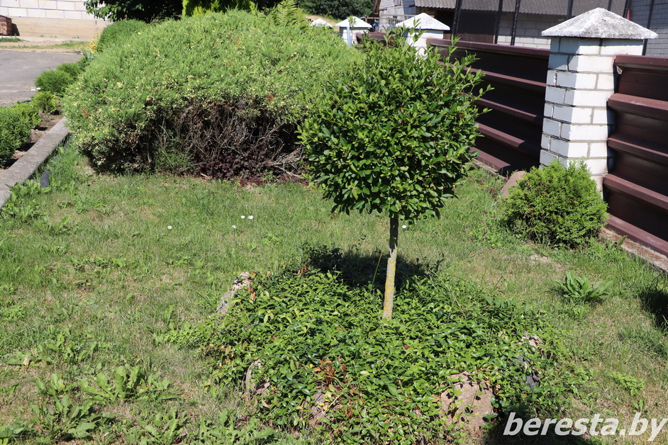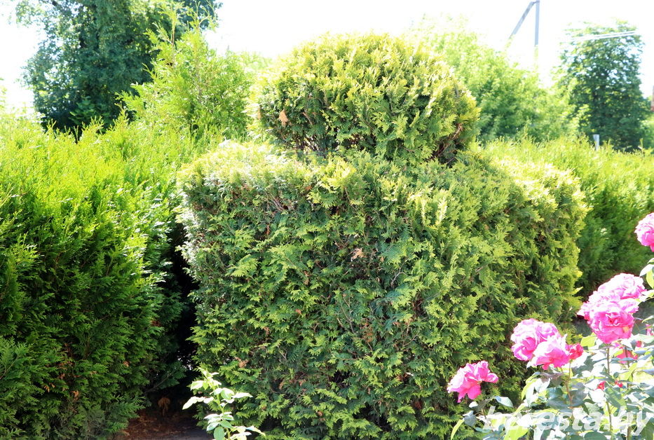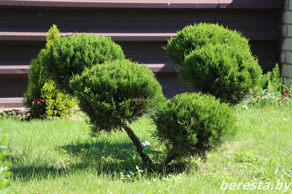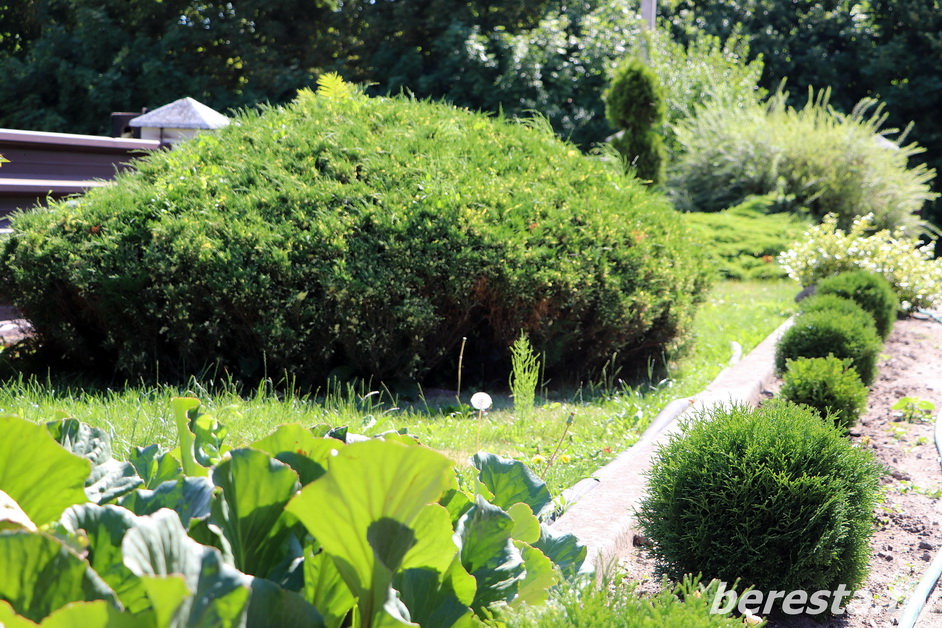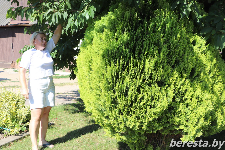 Действительно, в палисадке у Антонины Игнатович растут взрослые величественные туи, есть и топиарные формы. Очень эффектно смотрятся кустарники на штамбе.