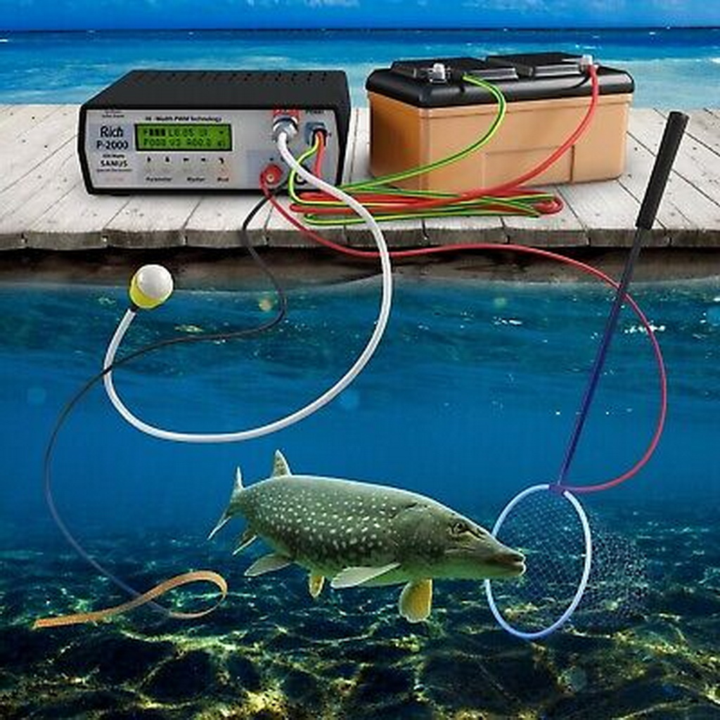 Электроудочка представляет собой сачок с проводами, по которым идет ток. Напряжение на выходе электроловильной установки (ЭЛУ) может достигать 1500 вольт, а радиус действия убийственной снасти – более десяти метров.