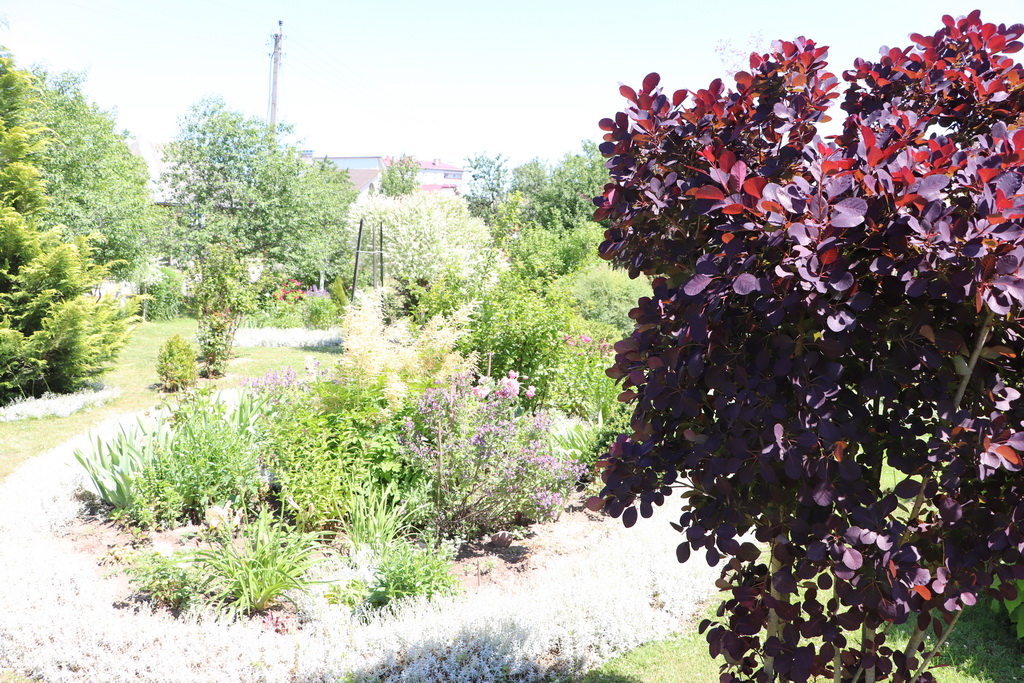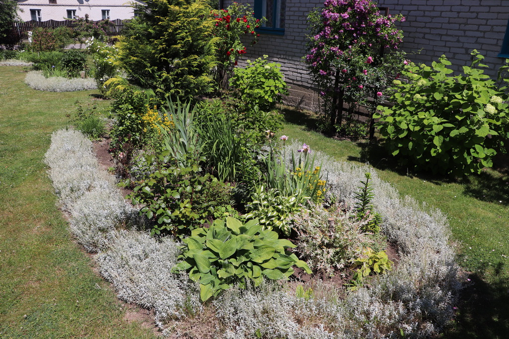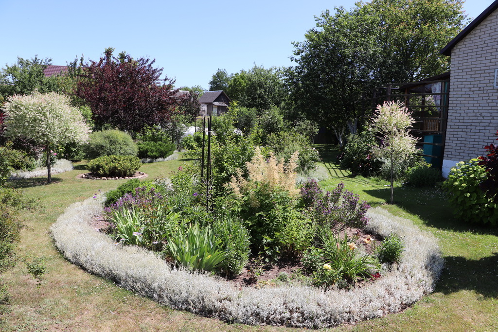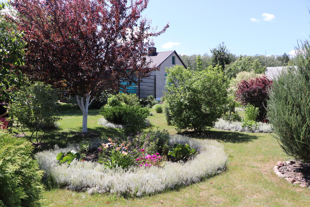 С каждым годом сад преображается. Наша героиня любит экспериментировать, сочетать различные растения по цвету и форме. На одной клумбе по соседствуют Волжанка, шалфей, лилейники, розы и декоративные кустарники. Каждая клумба индивидуальна в своем исполнении.