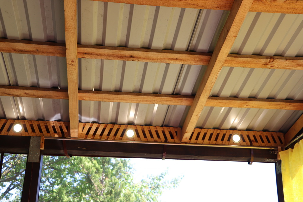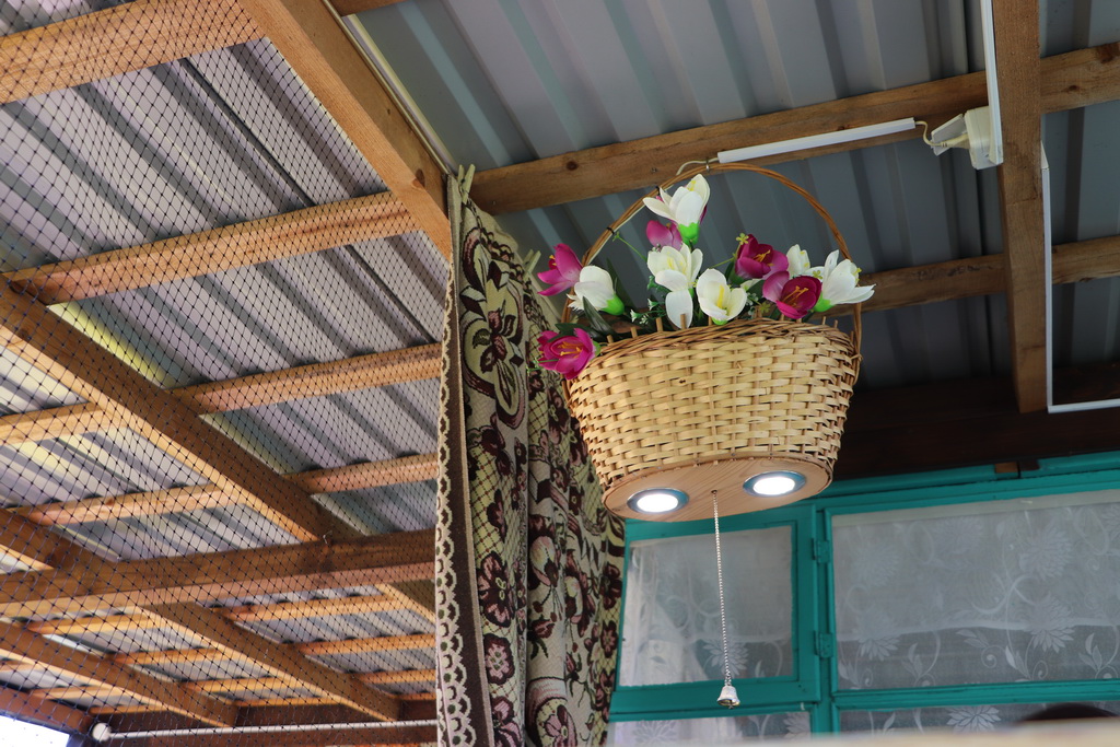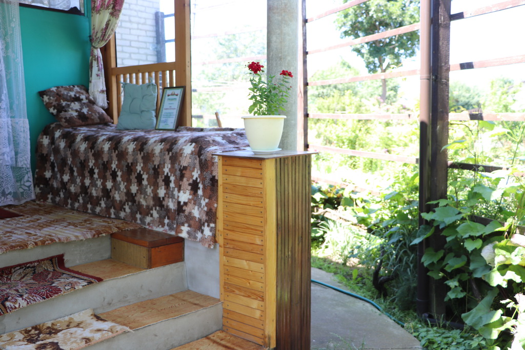 Чистота и порядок царит не только в саду, но и на всем приусадебном участке. Поддерживать эту красоту Людмиле помогает ее супруг Александр. Он своими руками создает уникальные вещи, например, сделал основу из дерева для летней террасы своими руками, смастерил компьютерный столик для жены и даже светильник.