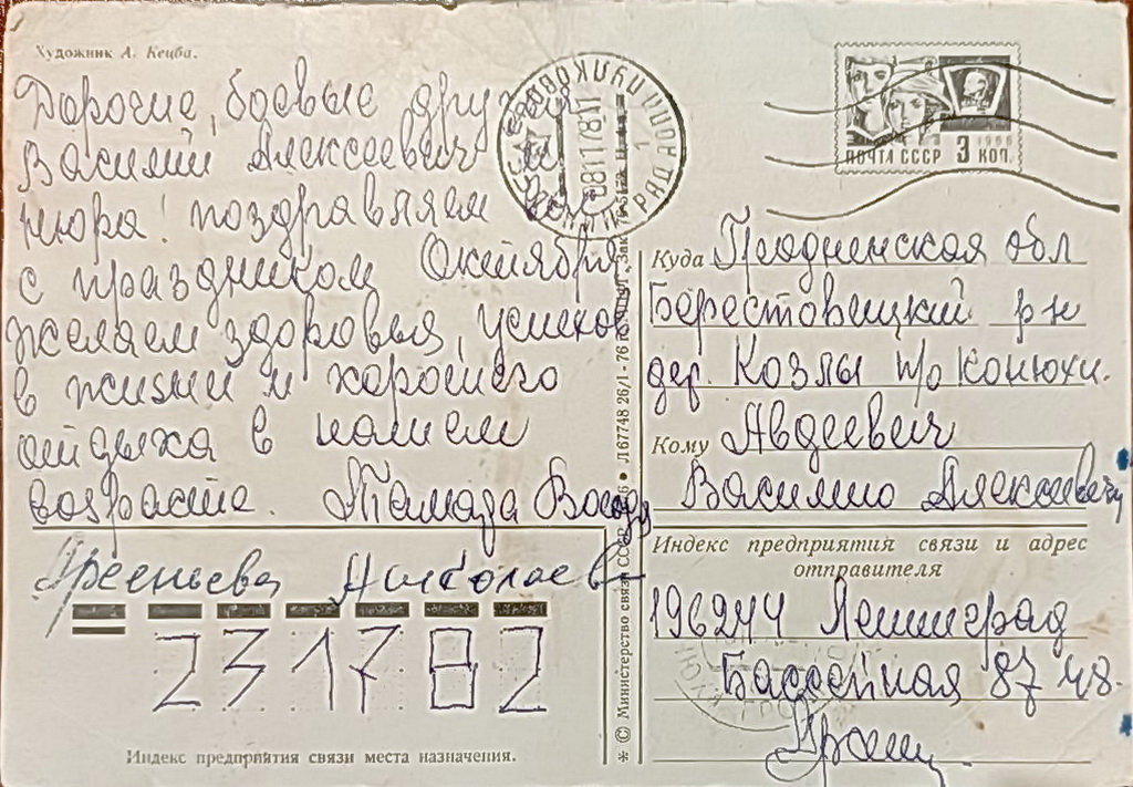 После окончания войны, в знак глубокой признательности, девушка-диверсант по возвращении в Ленинград ежегодно в преддверии 9 мая и 7 ноября отправляла открытки своим спасителям. Они подружились, поддерживали связь. Василий и Анна Авдеевич прожили в деревне Козлы долго и счастливо, воспитали детей, у них много внуков и правнуков.