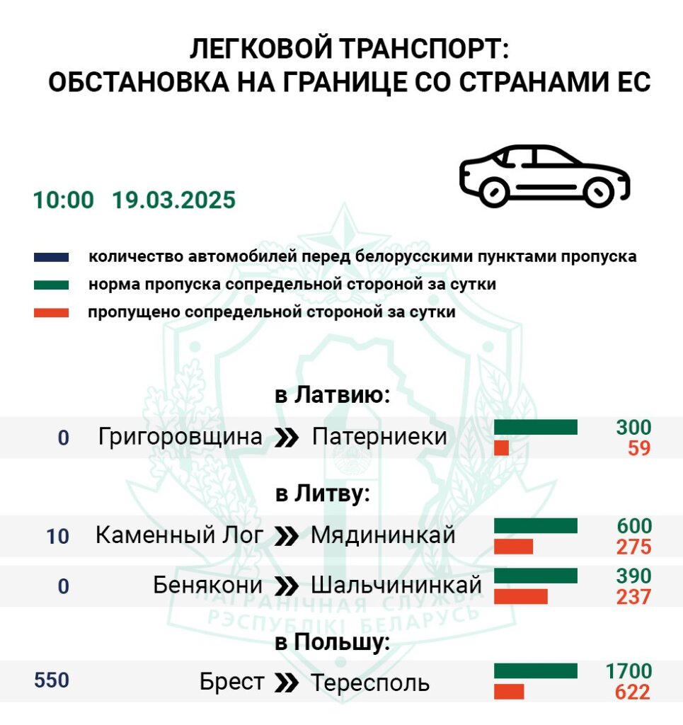 Незначительное количество легковых авто фиксируется перед литовским Мядининкаем (Каменный Лог) — в очереди находится 10 единиц транспорта.